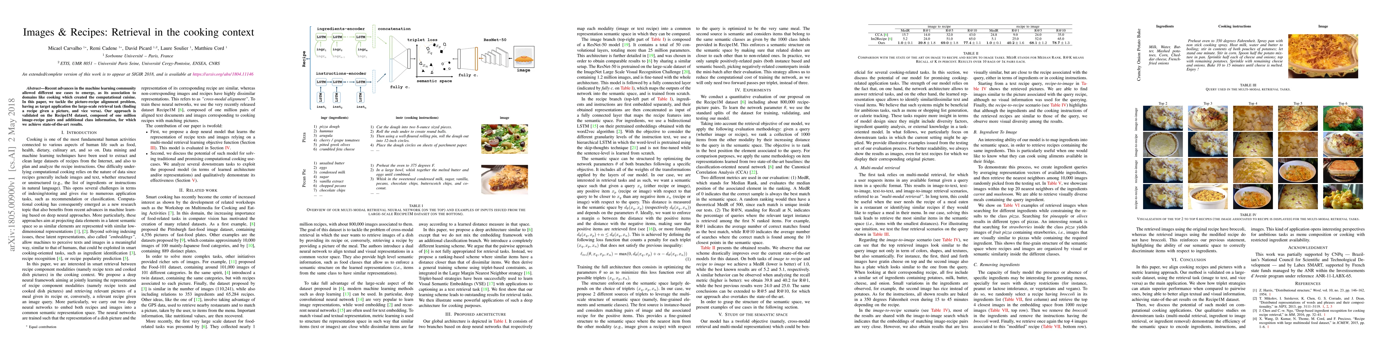 Recent advances in the machine learning community allowed different use cases to emerge, as its association to domains like cooking which created the computational cuisine. In this paper, we tackle the picture-recipe alignment problem, having as target application the large-scale retrieval task (finding a recipe given a picture, and vice versa). Our approach is validated on the Recipe1M dataset, composed of one million image-recipe pairs and additional class information, for which we achieve state-of-the-art results.