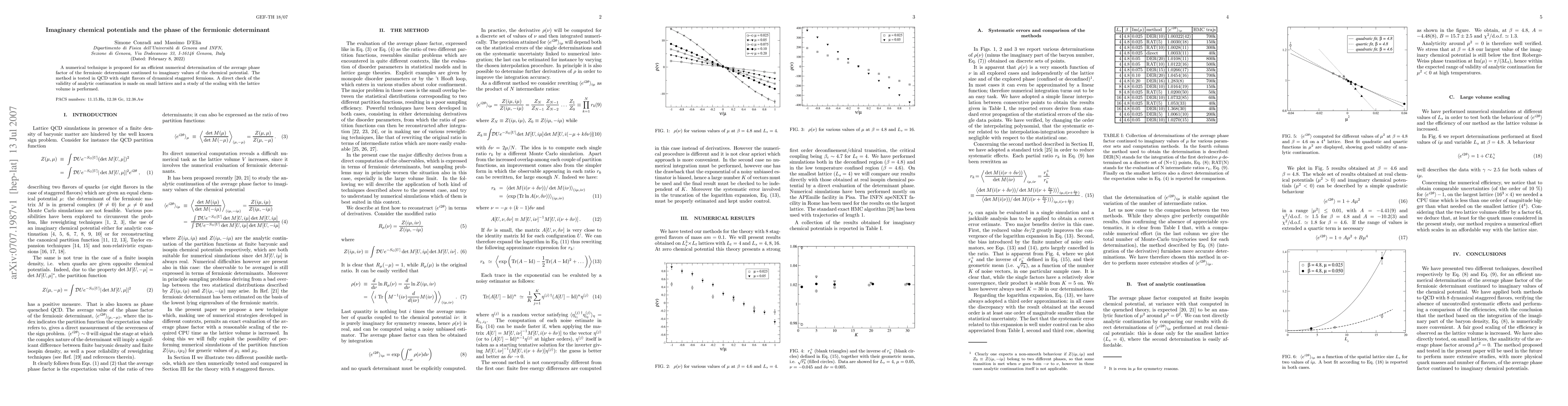 A numerical technique is proposed for an efficient numerical determination of the average phase factor of the fermionic determinant continued to imaginary values of the chemical potential. The method is tested in QCD with eight flavors of dynamical staggered fermions. A direct check of the validity of analytic continuation is made on small lattices and a study of the scaling with the lattice volume is performed.