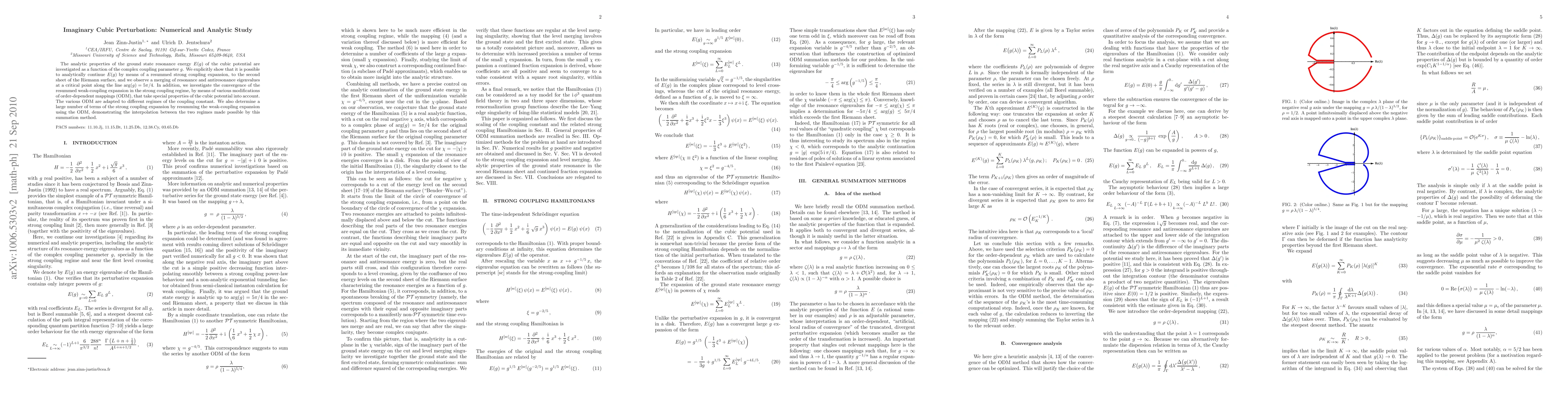 The analytic properties of the ground state resonance energy E(g) of the cubic potential are investigated as a function of the complex coupling parameter g. We explicitly show that it is possible to analytically continue E(g) by means of a resummed strong coupling expansion, to the second sheet of the Riemann surface, and we observe a merging of resonance and antiresonance eigenvalues at a critical point along the line arg(g) = 5 pi/4. In addition, we investigate the convergence of the resummed weak-coupling expansion in the strong coupling regime, by means of various modifications of order-dependent mappings (ODM), that take special properties of the cubic potential into account. The various ODM are adapted to different regimes of the coupling constant. We also determine a large number of terms of the strong coupling expansion by resumming the weak-coupling expansion using the ODM, demonstrating the interpolation between the two regimes made possible by this summation method.