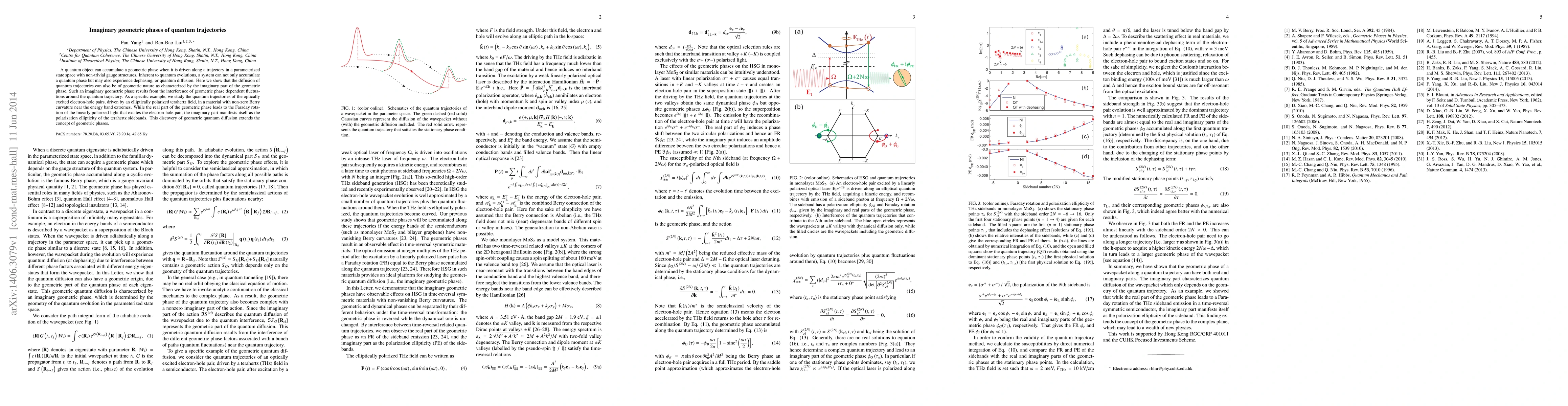 This paper explores the concept of geometric phases in quantum mechanics, demonstrating that quantum trajectories can accumulate not just real geometric phases but also an imaginary geometric phase due to quantum diffusion. Specifically, it examines electron-hole pairs in materials with non-zero Berry curvature, showing that the imaginary part manifests as polarization ellipticity of terahertz sidebands.
