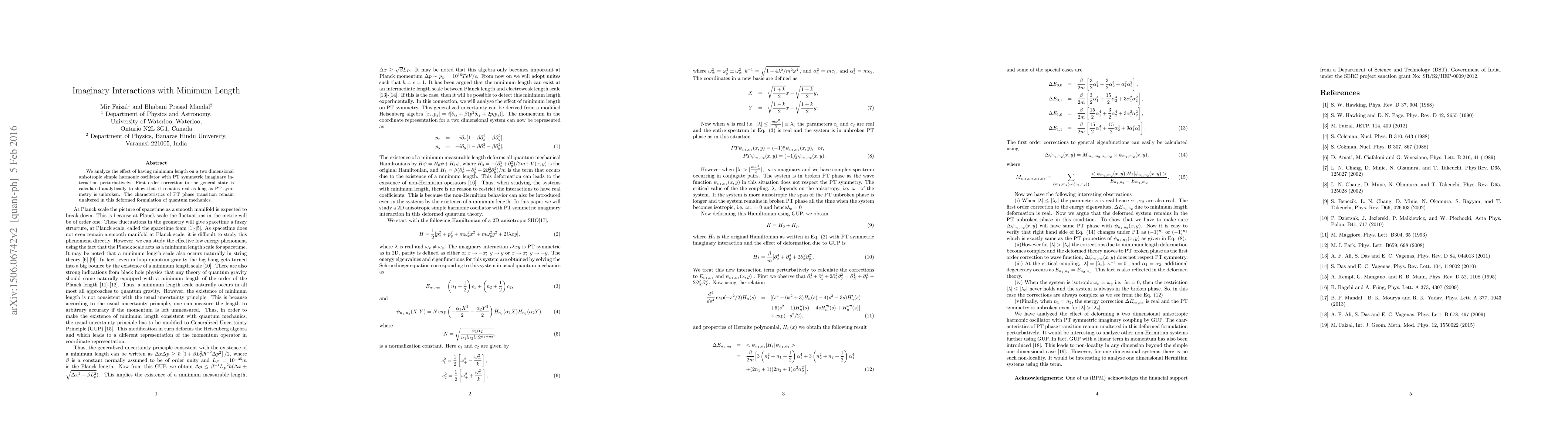We analyze the effect of having minimum length on a two dimensional anisotropic simple harmonic oscillator with PT symmetric imaginary interaction perturbatively. First order correction to the general state is calculated analytically to show that it remains real as long as PT symmetry is unbroken. The characteristics of PT phase transition remain unaltered in this deformed formulation of quantum mechanics.