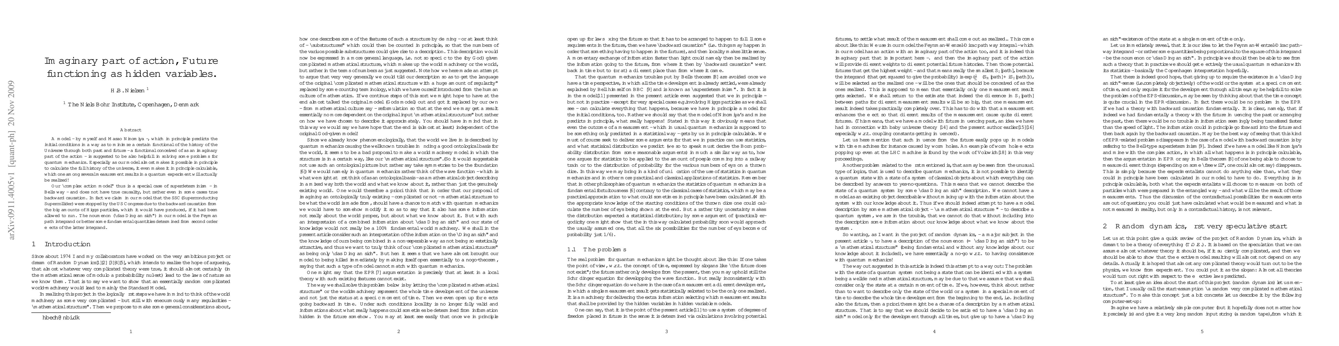 A model -- by myself and Masao Ninomiya -- which in principle predicts the initial conditions in a way as to minimze a certain functional of the history of the Universe through both past and future -- a functional conceived of as an imaginary part of the action -- is suggested to be also helpful in solving some problems for quantum mechanics. Especially as our model almost makes it possible in principle to calculate the full history of the universe, it even makes it in principle calculable, which one among several measurement results in a quantum experiment will actually be realized! Our "complex action model" thus is a special case of superdeterminism - in Bells way - and does not have true causality, but rather even in some cases true backward causation. In fact we claim in our model that the SSC (Superconducting Supercollider) were stopped by the US Congress due to the backward causation from the big amounts of Higgs particles, which it would have produced, if it had been allowed to run. The noumenon ("das Ding an sich") in our model is the Feyman path integrand or better some fundamental quantities determined from second order effects of the latter integrand.