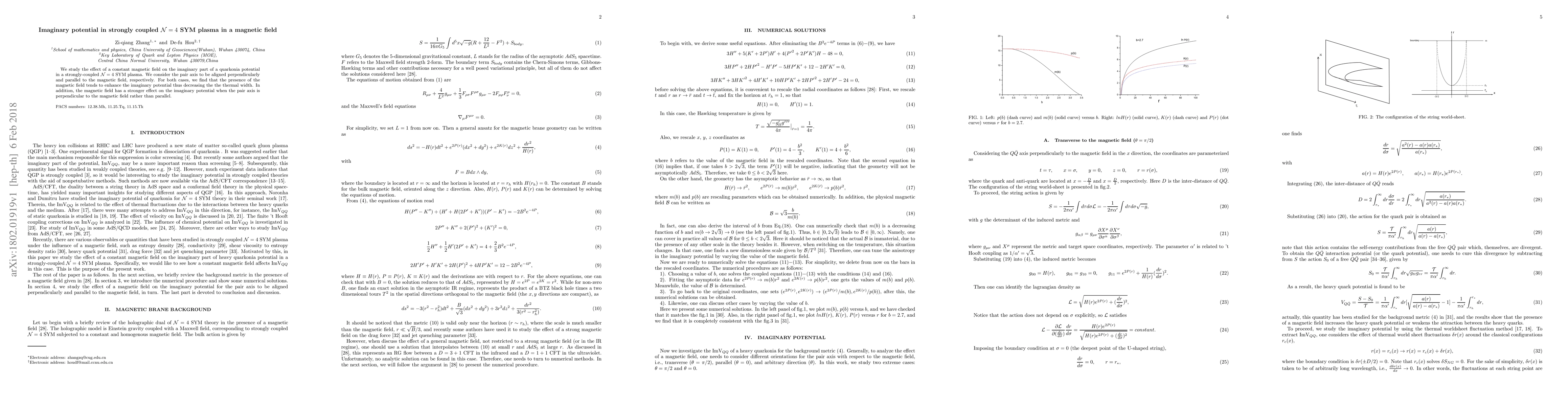 This research investigates how a constant magnetic field influences the imaginary part of the quarkonia potential in a strongly-coupled $\mathcal{N}=4$ SYM plasma, finding that the magnetic field enhances the imaginary potential and decreases the thermal width more significantly when the pair axis is perpendicular to the field.