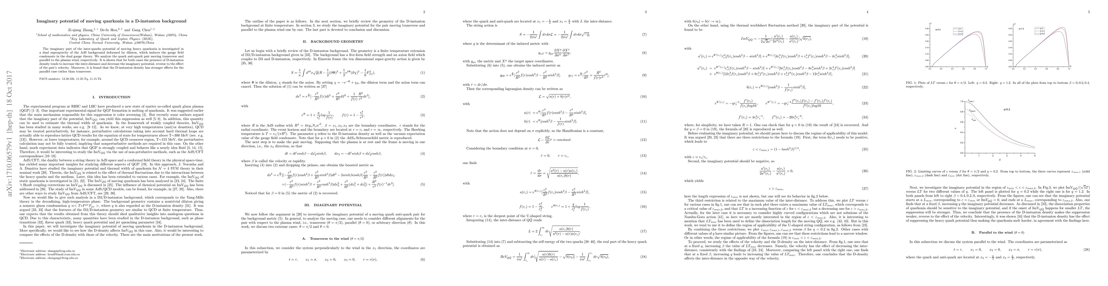The research investigates the imaginary part of the inter-quark potential for moving heavy quarkonia in a deformed AdS background with a dilaton field, representing D-instanton density. It considers quark-antiquark pairs moving transverse and parallel to the plasma wind.