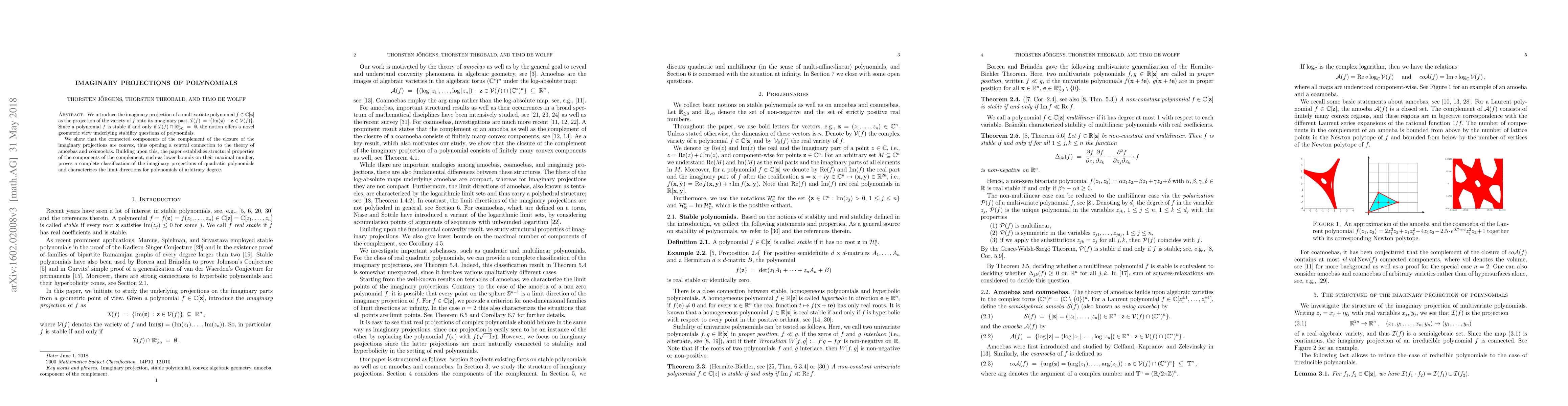 We introduce the imaginary projection of a multivariate polynomial $f \in \mathbb{C}[\mathbf{z}]$ as the projection of the variety of $f$ onto its imaginary part, $\mathcal{I}(f) \ = \ \{\text{Im}(\mathbf{z}) \, : \, \mathbf{z} \in \mathcal{V}(f) \}$. Since a polynomial $f$ is stable if and only if $\mathcal{I}(f) \cap \mathbb{R}_{>0}^n \ = \ \emptyset$, the notion offers a novel geometric view underlying stability questions of polynomials. We show that the connected components of the complement of the closure of the imaginary projections are convex, thus opening a central connection to the theory of amoebas and coamoebas. Building upon this, the paper establishes structural properties of the components of the complement, such as lower bounds on their maximal number, proves a complete classification of the imaginary projections of quadratic polynomials and characterizes the limit directions for polynomials of arbitrary degree.