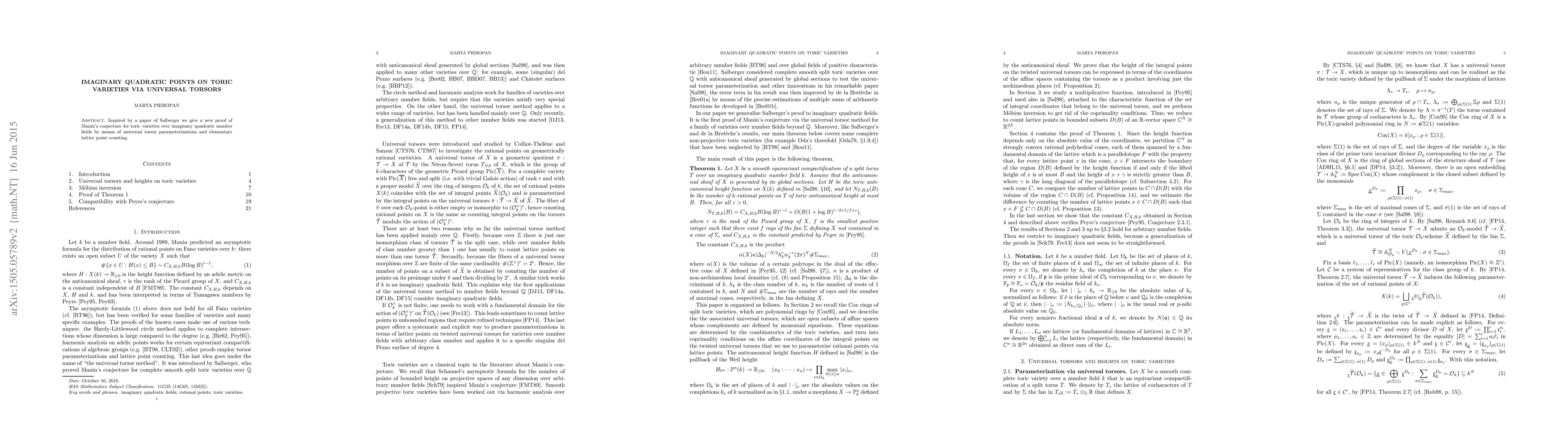 This paper provides a novel proof of Manin's conjecture for toric varieties over imaginary quadratic number fields using universal torsor parameterizations and basic lattice point counting techniques, inspired by Salberger's work.