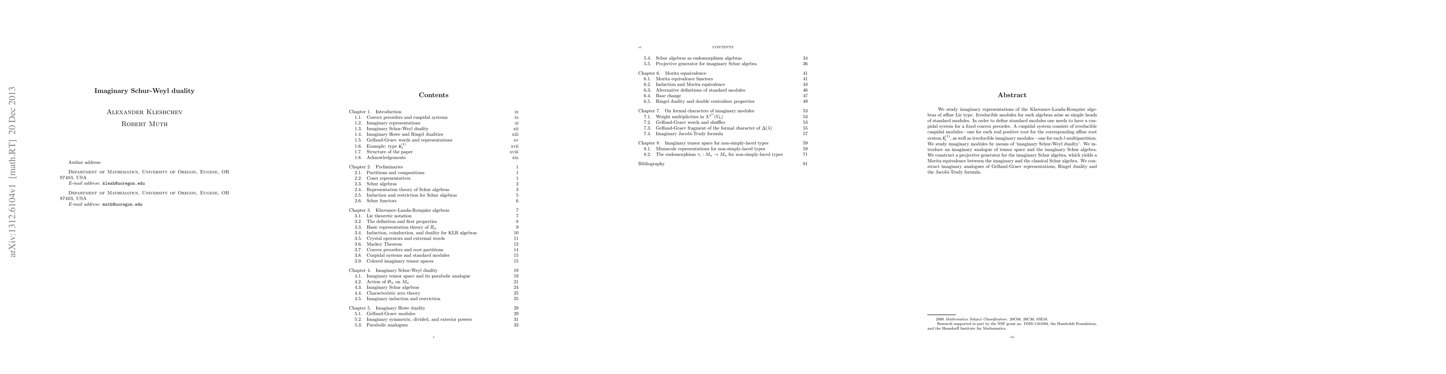 We study imaginary representations of the Khovanov-Lauda-Rouquier algebras of affine Lie type. Irreducible modules for such algebras arise as simple heads of standard modules. In order to define standard modules one needs to have a cuspidal system for a fixed convex preorder. A cuspidal system consists of irreducible cuspidal modules---one for each real positive root for the corresponding affine root system ${\tt X}_l^{(1)}$, as well as irreducible imaginary modules---one for each $l$-multipartition. We study imaginary modules by means of `imaginary Schur-Weyl duality'. We introduce an imaginary analogue of tensor space and the imaginary Schur algebra. We construct a projective generator for the imaginary Schur algebra, which yields a Morita equivalence between the imaginary and the classical Schur algebra. We construct imaginary analogues of Gelfand-Graev representations, Ringel duality and the Jacobi-Trudy formula.