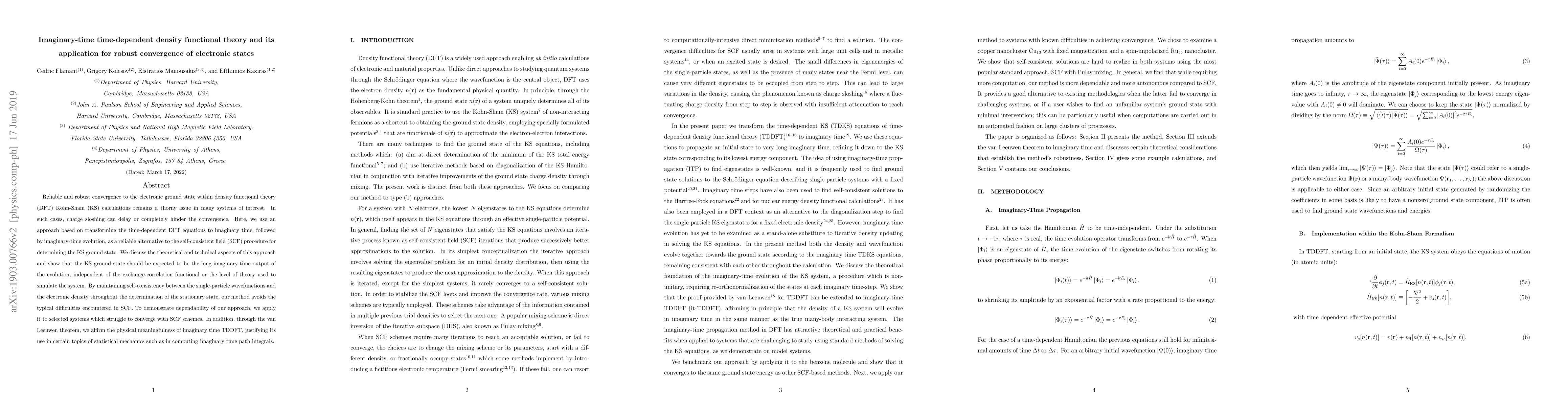 Reliable and robust convergence to the electronic ground state within density functional theory (DFT) Kohn-Sham (KS) calculations remains a thorny issue in many systems of interest. In such cases, charge sloshing can delay or completely hinder the convergence. Here, we use an approach based on transforming the time-dependent DFT equations to imaginary time, followed by imaginary-time evolution, as a reliable alternative to the self-consistent field (SCF) procedure for determining the KS ground state. We discuss the theoretical and technical aspects of this approach and show that the KS ground state should be expected to be the long-imaginary-time output of the evolution, independent of the exchange-correlation functional or the level of theory used to simulate the system. By maintaining self-consistency between the single-particle wavefunctions and the electronic density throughout the determination of the stationary state, our method avoids the typical difficulties encountered in SCF. To demonstrate dependability of our approach, we apply it to selected systems which struggle to converge with SCF schemes. In addition, through the van Leeuwen theorem, we affirm the physical meaningfulness of imaginary time TDDFT, justifying its use in certain topics of statistical mechanics such as in computing imaginary time path integrals.
