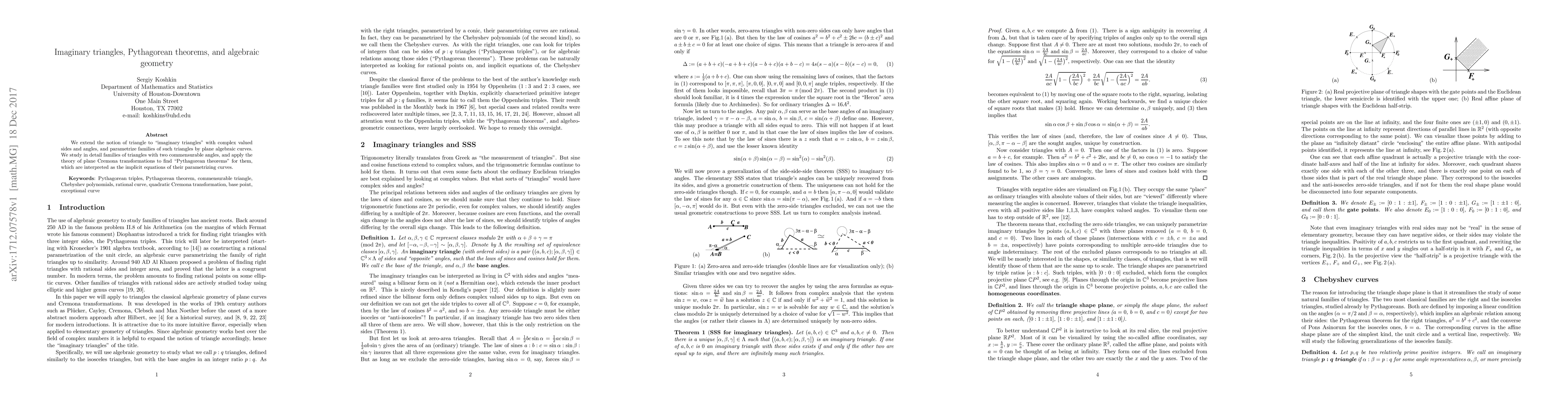 We extend the notion of triangle to "imaginary triangles" with complex valued sides and angles, and parametrize families of such triangles by plane algebraic curves. We study in detail families of triangles with two commensurable angles, and apply the theory of plane Cremona transformations to find "Pythagorean theorems" for them, which are interpreted as the implicit equations of their parametrizing curves.