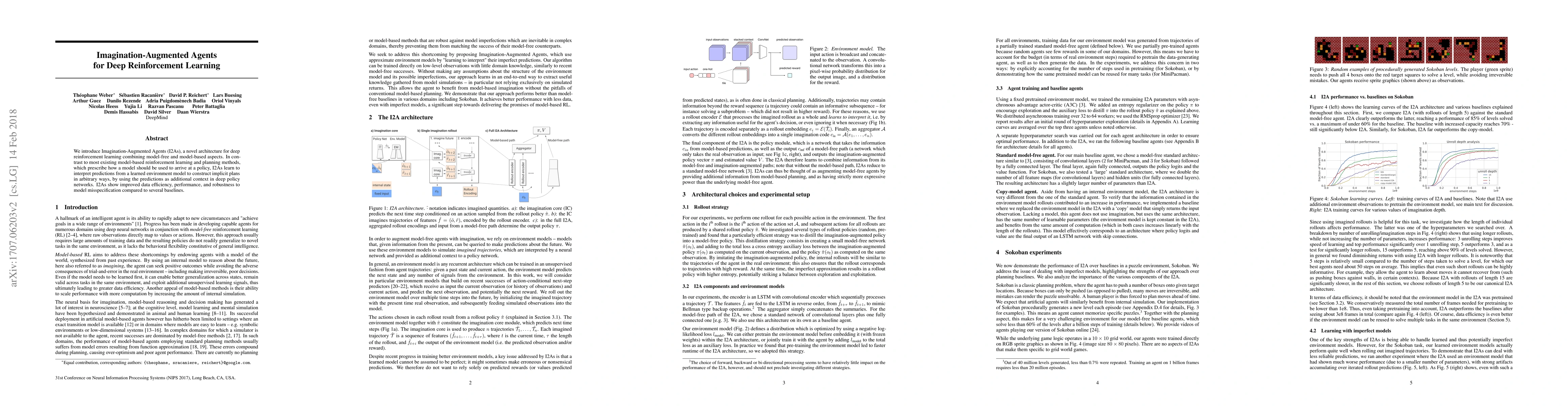 Summary: Imagination-Augmented Agents (I2As) combine model-free and model-based deep reinforcement learning to enhance data efficiency, performance, and robustness. Unlike traditional methods, I2As use learned environment models to generate flexible, implicit plans, outperforming several baselines.