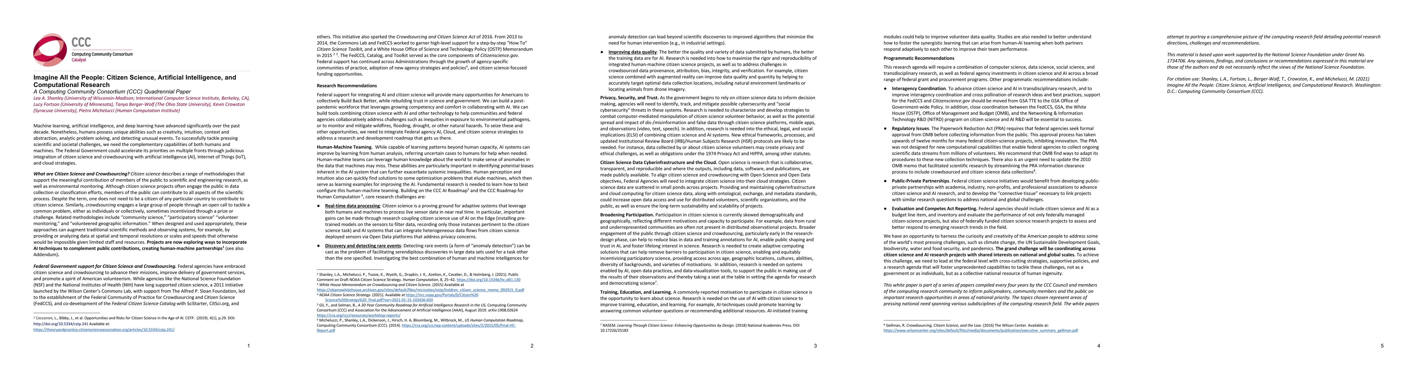 Summary: This paper explores how integrating citizen science, crowdsourcing, and artificial intelligence (AI) can enhance scientific and societal challenges, emphasizing the unique human capabilities that complement machine learning advancements. It suggests leveraging these approaches to accelerate government priorities through strategic use of AI, IoT, and cloud computing.