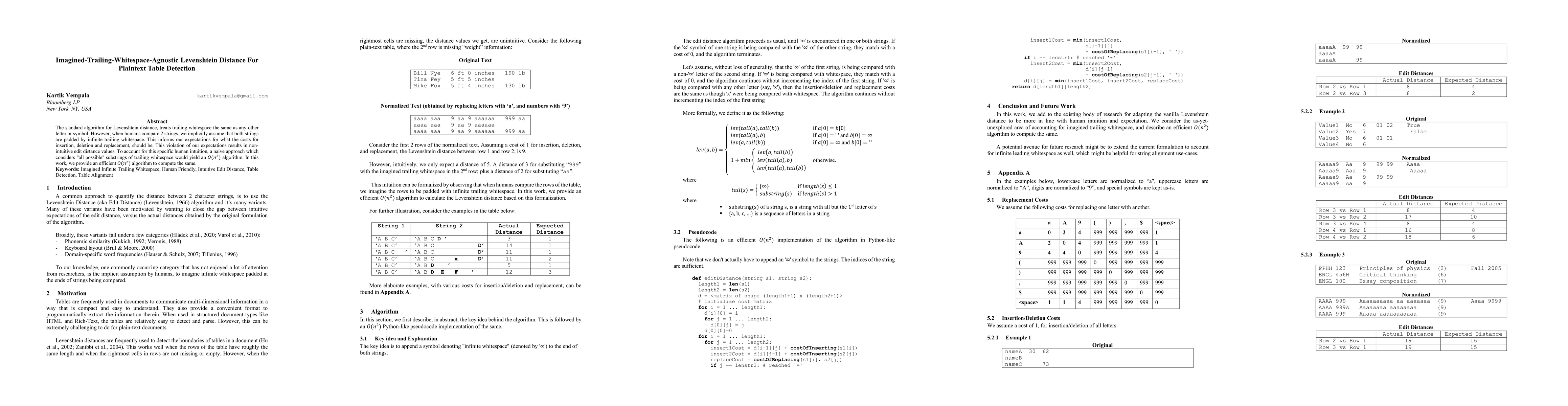 This paper proposes an efficient $O(n^2)$ algorithm for computing the Imagined-Trailing-Whitespace-Agnostic Levenshtein Distance, which accounts for human intuition by treating trailing whitespace differently, aiming to provide more intuitive edit distance values for plaintext table detection and alignment.
