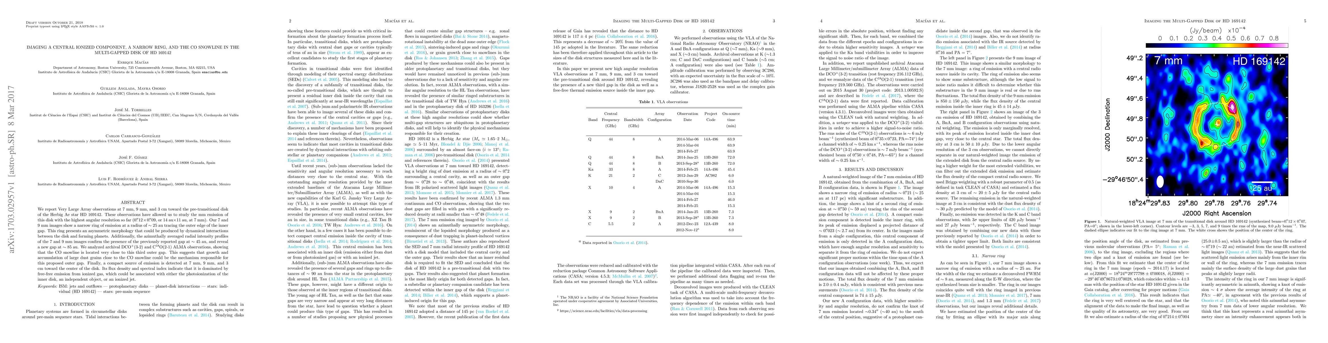 We report Very Large Array observations at 7 mm, 9 mm, and 3 cm toward the pre-transitional disk of the Herbig Ae star HD 169142. These observations have allowed us to study the mm emission of this disk with the highest angular resolution so far ($0\rlap."12\times0\rlap."09$, or 14 au$\times$11 au, at 7 mm). Our 7 and 9 mm images show a narrow ring of emission at a radius of $\sim25$ au tracing the outer edge of the inner gap. This ring presents an asymmetric morphology that could be produced by dynamical interactions between the disk and forming planets. Additionally, the azimuthally averaged radial intensity profiles of the 7 and 9 mm images confirm the presence of the previously reported gap at $\sim45$ au, and reveal a new gap at $\sim85$ au. We analyzed archival DCO$^+$(3-2) and C$^{18}$O(2-1) ALMA observations, showing that the CO snowline is located very close to this third outer gap. This suggests that growth and accumulation of large dust grains close to the CO snowline could be the mechanism responsible for this proposed outer gap. Finally, a compact source of emission is detected at 7 mm, 9 mm, and 3 cm toward the center of the disk. Its flux density and spectral index indicate that it is dominated by free-free emission from ionized gas, which could be associated with either the photoionization of the inner disk, an independent object, or an ionized jet.