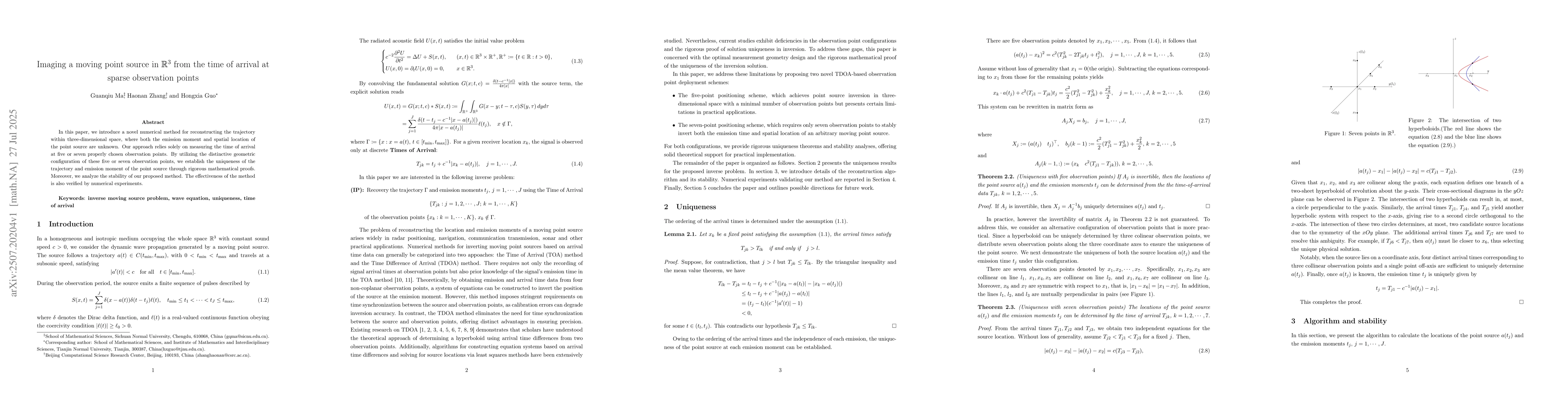 In this paper, we introduce a novel numerical method for reconstructing the trajectory within three-dimensional space, where both the emission moment and spatial location of the point source are unknown. Our approach relies solely on measuring the time of arrival at five or seven properly chosen observation points. By utilizing the distinctive geometric configuration of these five or seven observation points, we establish the uniqueness of the trajectory and emission moment of the point source through rigorous mathematical proofs. Moreover, we analyze the stability of our proposed method. The effectiveness of the method is also verified by numerical experiments.