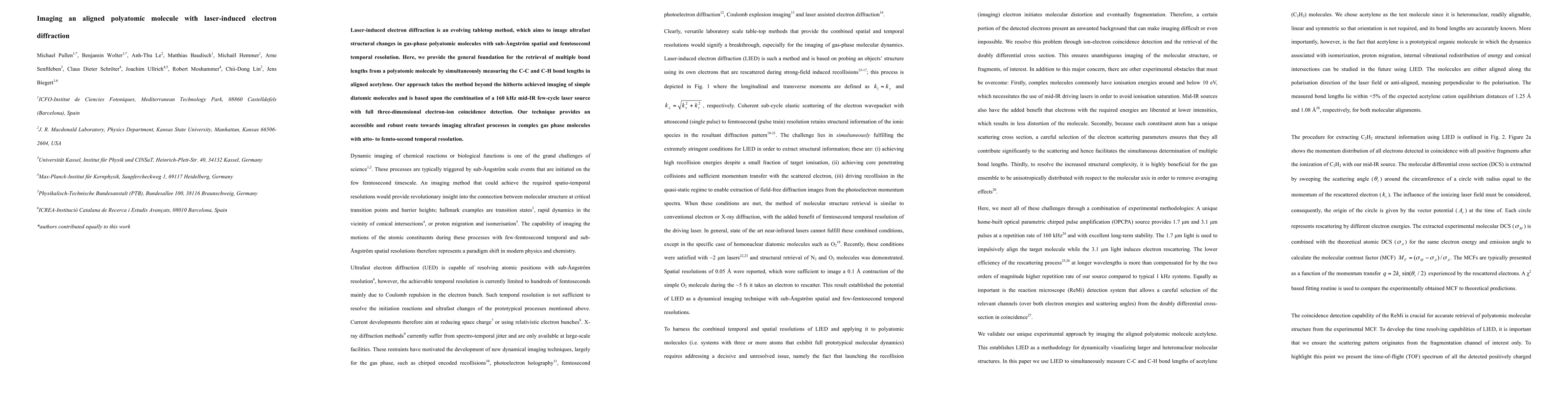 Laser-induced electron diffraction is an evolving tabletop method, which aims to image ultrafast structural changes in gas-phase polyatomic molecules with sub-{\AA}ngstr\"om spatial and femtosecond temporal resolution. Here, we provide the general foundation for the retrieval of multiple bond lengths from a polyatomic molecule by simultaneously measuring the C-C and C-H bond lengths in aligned acetylene. Our approach takes the method beyond the hitherto achieved imaging of simple diatomic molecules and is based upon the combination of a 160 kHz mid-IR few-cycle laser source with full three-dimensional electron-ion coincidence detection. Our technique provides an accessible and robust route towards imaging ultrafast processes in complex gas phase molecules with atto- to femto-second temporal resolution.