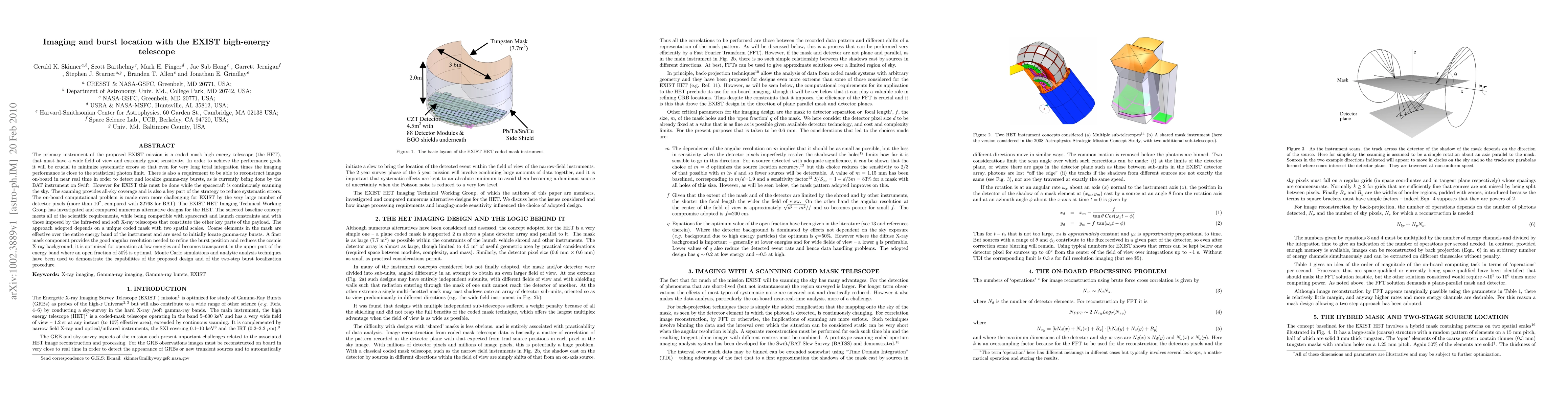 The primary instrument of the proposed EXIST mission is a coded mask high energy telescope (the HET), that must have a wide field of view and extremely good sensitivity. It will be crucial to minimize systematic errors so that even for very long total integration times the imaging performance is close to the statistical photon limit. There is also a requirement to be able to reconstruct images on-board in near real time in order to detect and localize gamma-ray bursts. This must be done while the spacecraft is scanning the sky. The scanning provides all-sky coverage and is key to reducing systematic errors. The on-board computational problem is made even more challenging for EXIST by the very large number of detector pixels. Numerous alternative designs for the HET have been evaluated. The baseline concept adopted depends on a unique coded mask with two spatial scales. Monte Carlo simulations and analytic analysis techniques have been used to demonstrate the capabilities of the design and of the proposed two-step burst localization procedure.