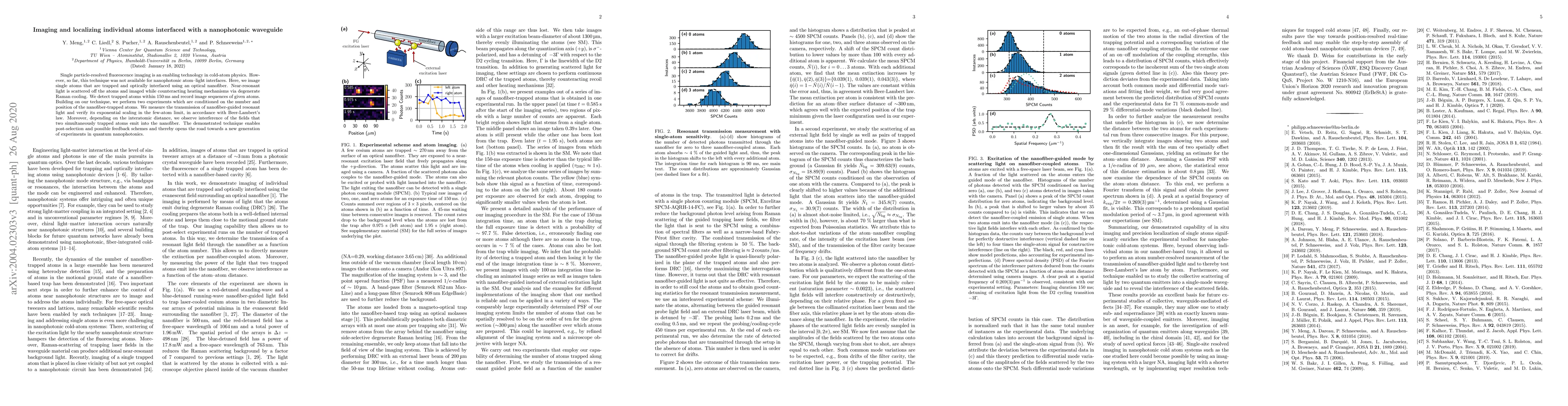 This paper presents a novel technique for imaging and localizing individual atoms interfaced with a nanophotonic waveguide using single particle-resolved fluorescence imaging. The method employs an optical nanofiber to trap and optically interface atoms, enabling detection and imaging sequences, and demonstrates interference effects and exponential scaling of light transmission in the few-atom limit.