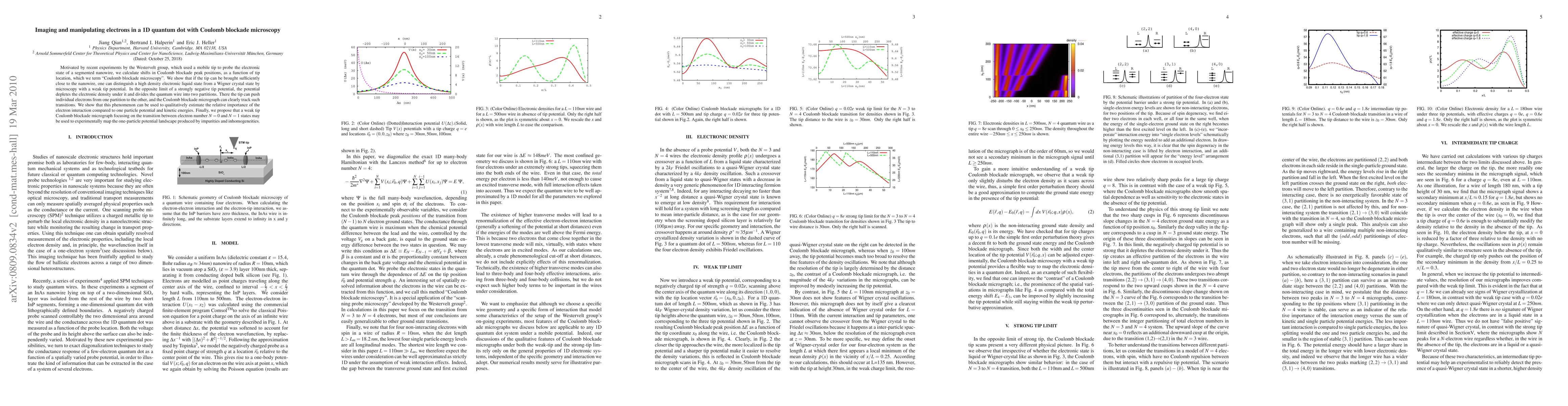 This paper explores the use of Coulomb blockade microscopy to image and manipulate electrons in a 1D quantum dot on a nanowire, revealing shifts in peak positions with varying tip potential. It demonstrates the ability to distinguish between electronic liquid and Wigner crystal states, and proposes using weak tip potentials to map the one-particle potential landscape.