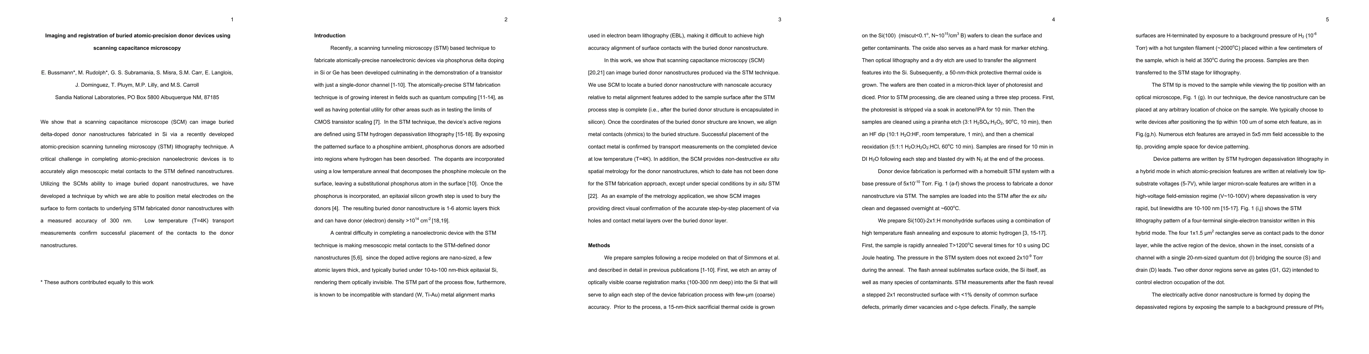 This paper demonstrates the use of scanning capacitance microscopy (SCM) to image and register buried delta-doped donor nanostructures in Si created by atomic-precision scanning tunneling microscopy (STM) lithography. The authors developed a technique to accurately position metal contacts on the surface to align with underlying nanostructures, achieving a registration accuracy of 300 nm, confirmed by low-temperature transport measurements.