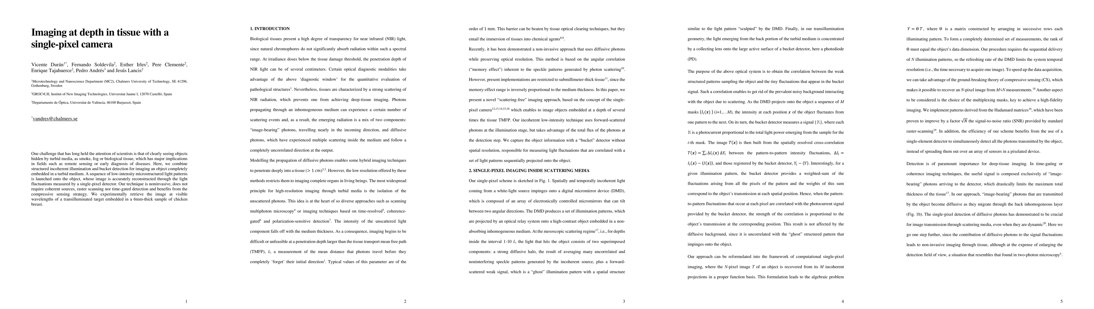 One challenge that has long held the attention of scientists is that of clearly seeing objects hidden by turbid media, as smoke, fog or biological tissue, which has major implications in fields such as remote sensing or early diagnosis of diseases. Here, we combine structured incoherent illumination and bucket detection for imaging an object completely embedded in a turbid medium. A sequence of low-intensity microstructured light patterns is launched onto the object, whose image is accurately reconstructed through the light fluctuations measured by a single-pixel detector. Our technique is noninvasive, does not require coherent sources, raster scanning nor time-gated detection and benefits from the compressive sensing strategy. We experimentally retrieve the image at visible wavelengths of a transilluminated target embedded in a 6mm-thick sample of chicken breast.