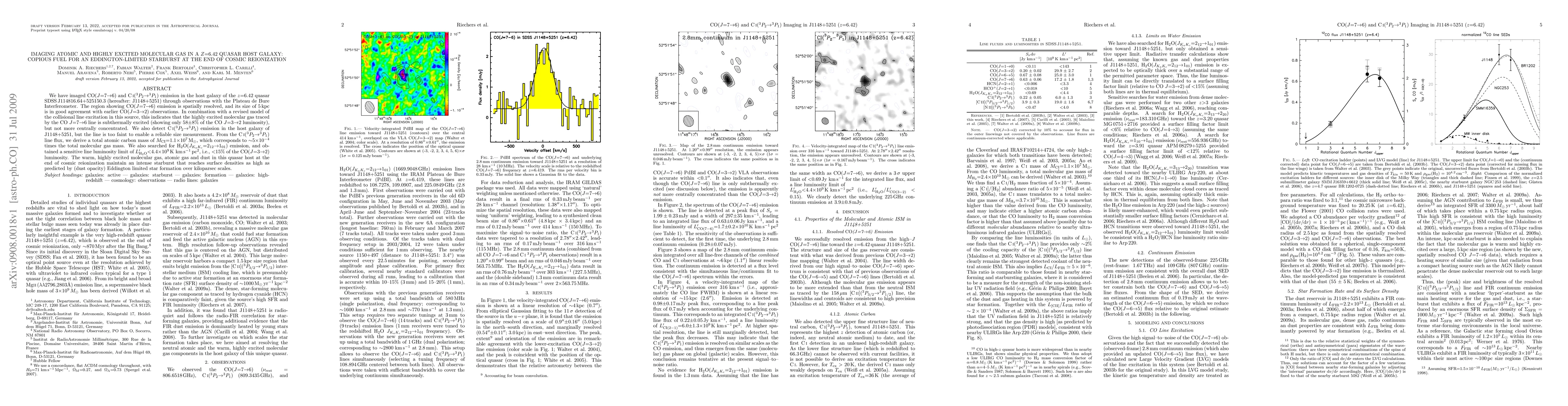 We have imaged CO(J=7-6) and CI(3P2-3P1) emission in the host galaxy of the z=6.42 quasar SDSS J114816.64+525150.3 (hereafter: J1148+5251) through observations with the Plateau de Bure Interferometer. The region showing CO(J=7-6) emission is spatially resolved, and its size of 5 kpc is in good agreement with earlier CO(J=3-2) observations. In combination with a revised model of the collisional line excitation in this source, this indicates that the highly excited molecular gas traced by the CO J=7-6 line is subthermally excited (showing only 58+/-8% of the CO J=3-2 luminosity), but not more centrally concentrated. We also detect CI(3P2-3P1) emission in the host galaxy of J1148+5251, but the line is too faint to enable a reliable size measurement. From the CI(3P2-3P1) line flux, we derive a total atomic carbon mass of M_CI=1.1x10^7 M_sun, which corresponds to ~5x10^-4 times the total molecular gas mass. We also searched for H2O(J_KaKc=2_12-1_01) emission, and obtained a sensitive line luminosity limit of L'_H2O<4.4x10^9 K kms pc^2, i.e., <15% of the CO(J=3-2) luminosity. The warm, highly excited molecular gas, atomic gas and dust in this quasar host at the end of cosmic reionization maintain an intense starburst that reaches surface densities as high as predicted by (dust opacity) Eddington limited star formation over kiloparsec scales.