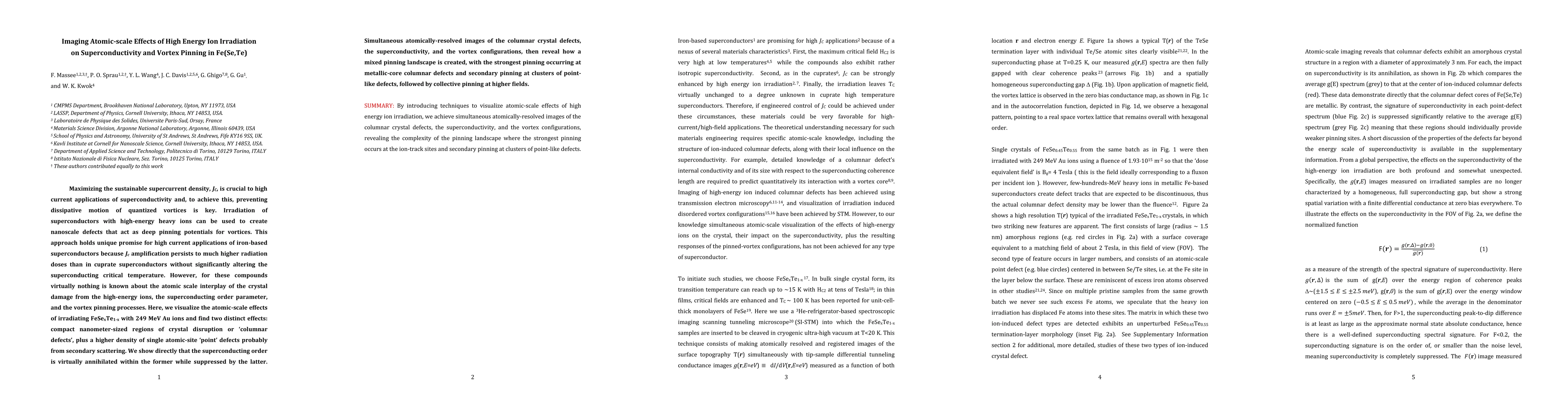 This paper investigates the atomic-scale effects of high-energy ion irradiation on superconductivity and vortex pinning in Fe(Se,Te) superconductors, revealing the creation of columnar defects and point defects that disrupt superconductivity and create a mixed pinning landscape for vortices. The study shows that columnar defects provide the strongest pinning, while point defects contribute secondary pinning, enhancing supercurrent density.