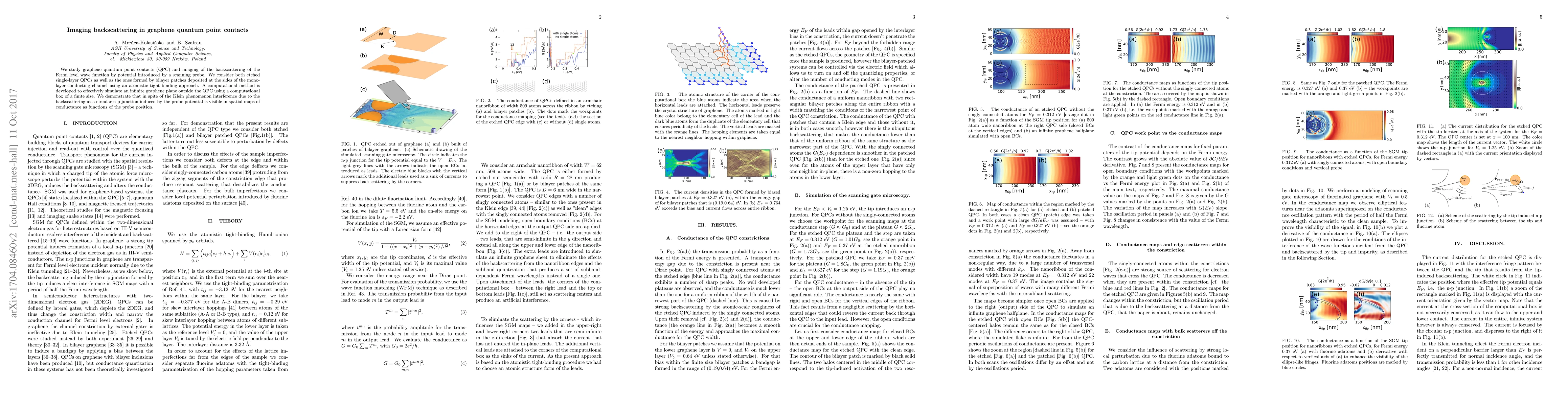 We study graphene quantum point contacts (QPC) and imaging of the backscattering of the Fermi level wave function by potential introduced by a scanning probe. We consider both etched single-layer QPCs as well as the ones formed by bilayer patches deposited at the sides of the monolayer conducting channel using an atomistic tight binding approach. A computational method is developed to effectively simulate an infinite graphene plane outside the QPC using a computational box of a finite size. We demonstrate that in spite of the Klein phenomenon interference due to the backscattering at a circular n-p junction induced by the probe potential is visible in spatial maps of conductance as functions of the probe position.
