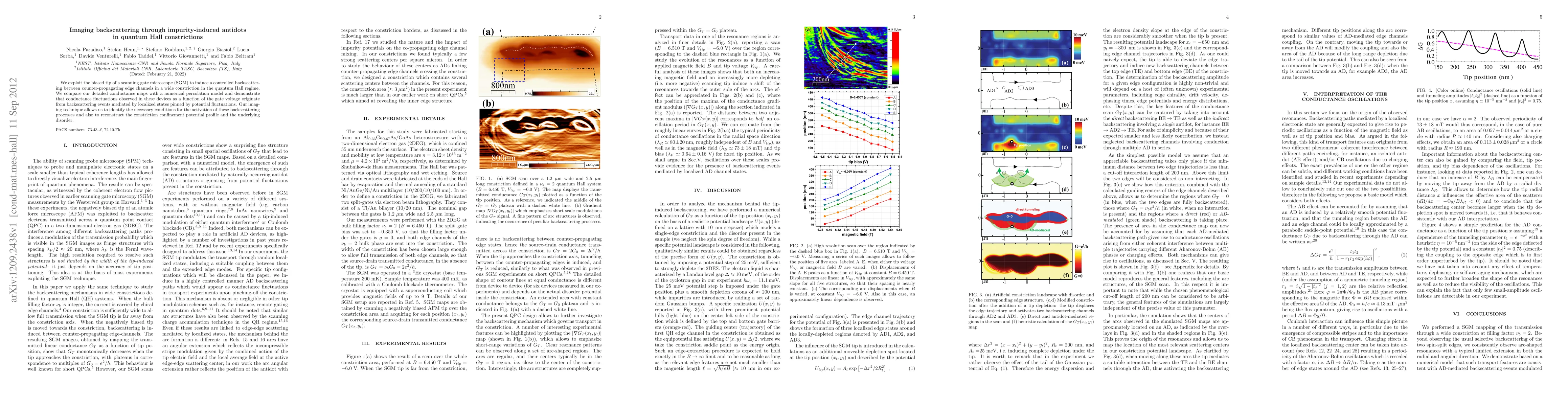 We exploit the biased tip of a scanning gate microscope (SGM) to induce a controlled backscattering between counter-propagating edge channels in a wide constriction in the quantum Hall regime. We compare our detailed conductance maps with a numerical percolation model and demonstrate that conductance fluctuations observed in these devices as a function of the gate voltage originate from backscattering events mediated by localized states pinned by potential fluctuations. Our imaging technique allows us to identify the necessary conditions for the activation of these backscattering processes and also to reconstruct the constriction confinement potential profile and the underlying disorder.