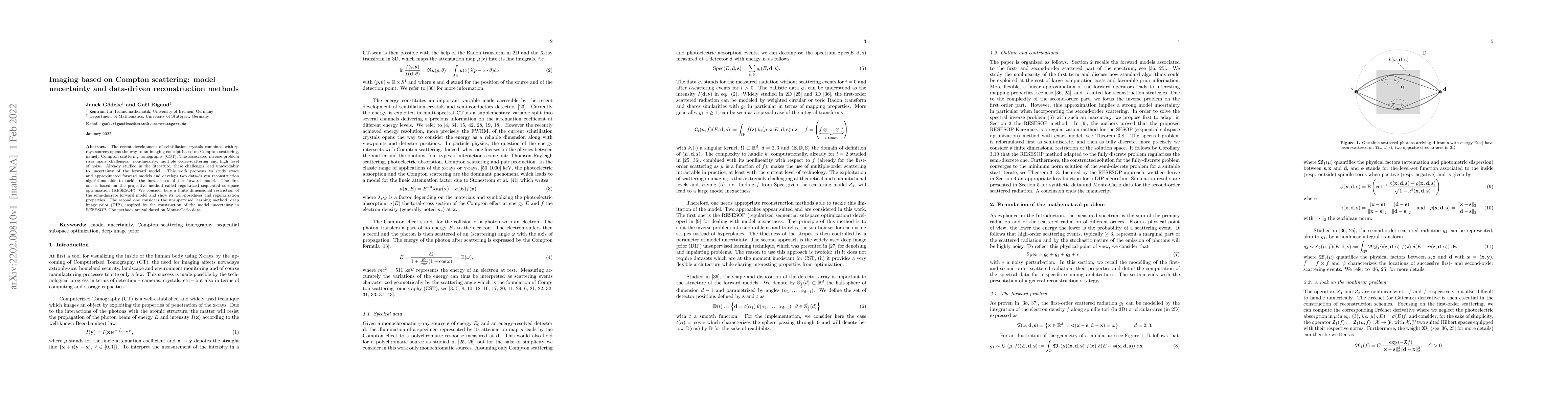 This paper explores Compton scattering tomography (CST) using scintillation crystals and $\gamma$-rays, addressing the challenges of non-linearity and noise. It proposes two data-driven reconstruction algorithms: regularized sequential subspace optimization (RESESOP) and deep image prior (DIP), validated on Monte-Carlo data to handle model uncertainties.