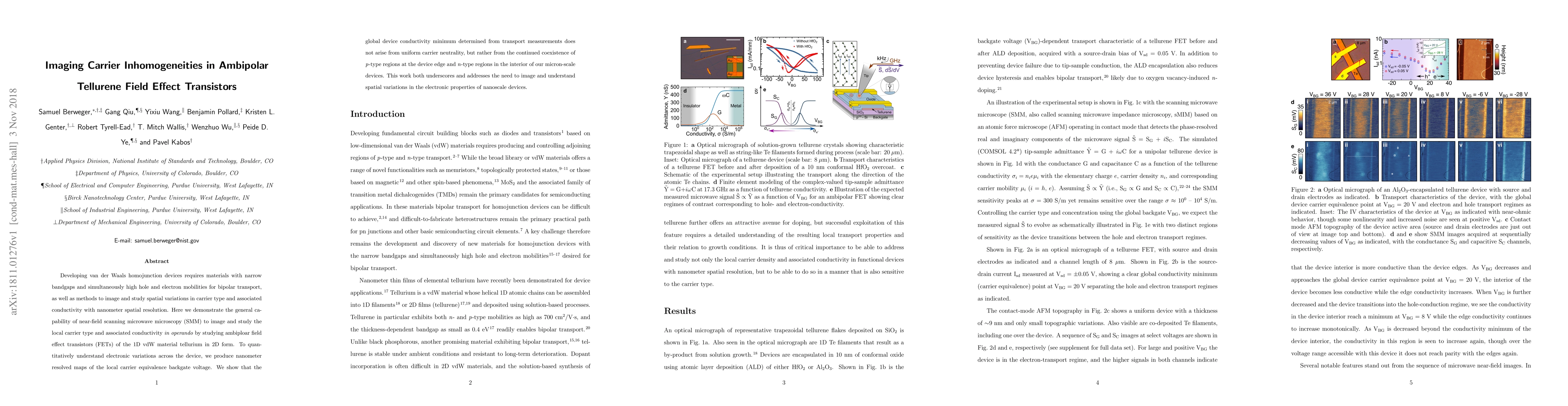 Researchers used near-field scanning microwave microscopy to image carrier inhomogeneities in ambipolar tellurene field-effect transistors, revealing localized p-type and n-type regions that contribute to the device's global conductivity minimum.