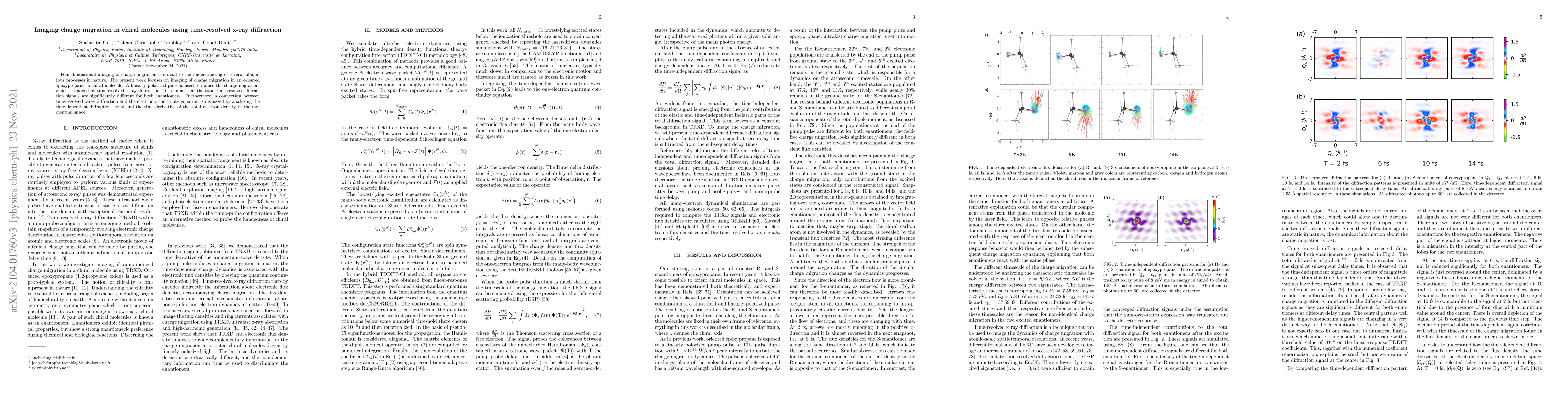 This study employs time-resolved x-ray diffraction to visualize charge migration in chiral epoxypropane molecules, revealing distinct diffraction signals for different enantiomers. The research also explores the relationship between the diffraction signals and the electronic continuity equation through analysis of electron density changes.