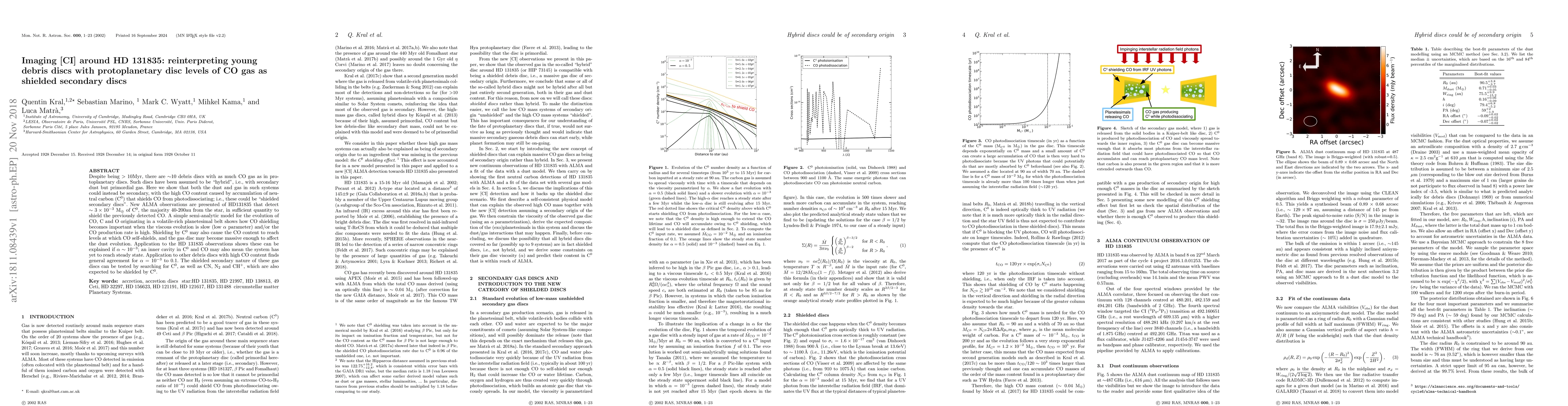 This paper reinterprets the high CO gas levels in some debris discs, suggesting they are "shielded secondary discs" where neutral carbon (C$^0$) shields CO from photodissociation, rather than hybrid systems with secondary dust and primordial gas. ALMA observations of HD 131835 support this model by detecting sufficient C$^0$ to shield CO, and a semi-analytic model indicates that slow viscous evolution and high CO production rates favor this shielding mechanism.