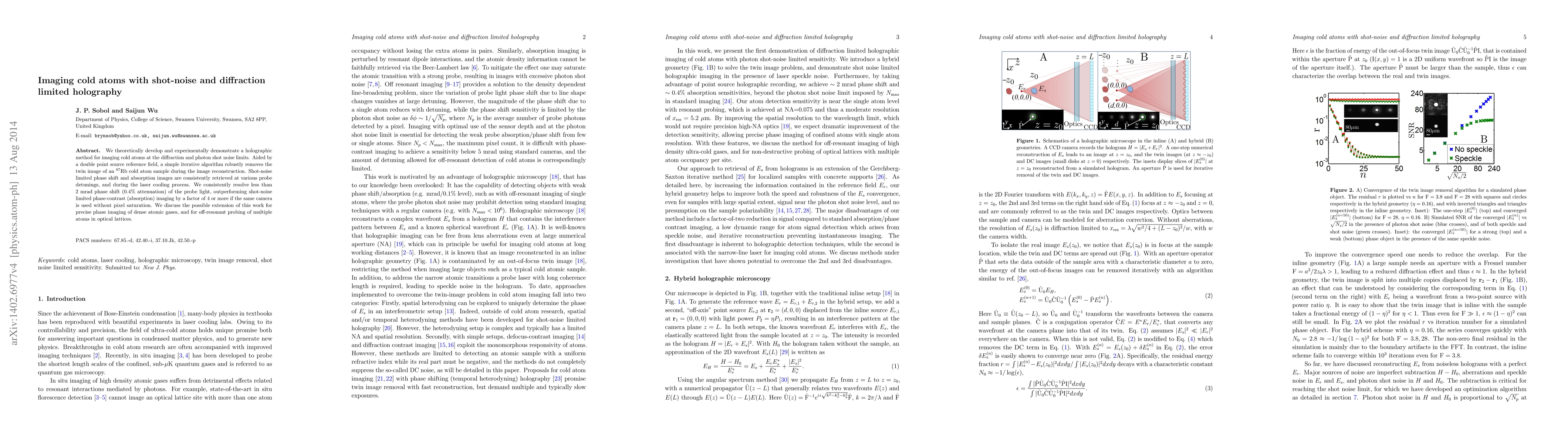 This paper presents a theoretical and experimental holographic method for imaging cold atoms at the diffraction and photon shot noise limits, achieving shot-noise limited phase shift and absorption images. The method robustly removes twin images using a double point source reference, outperforming traditional phase-contrast imaging by a factor of 4 or more.