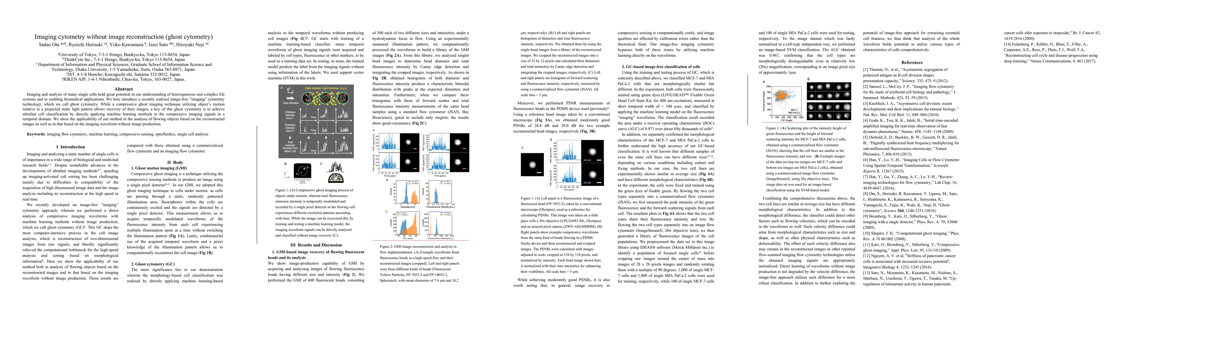 This paper introduces "ghost cytometry," a novel image-free cytometry technology that uses compressive ghost imaging and machine learning to classify single cells rapidly without image reconstruction. The method demonstrates its effectiveness in analyzing flowing objects both from reconstructed images and directly from imaging waveforms.