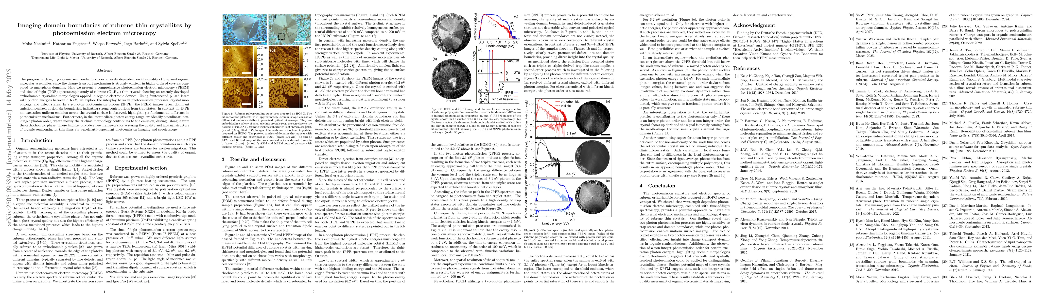The paper presents a novel approach combining PEEM and TOF spectroscopy to study photoemission processes in rubrene thin crystals, revealing distinct emission mechanisms at domain boundaries and across the crystal surface.