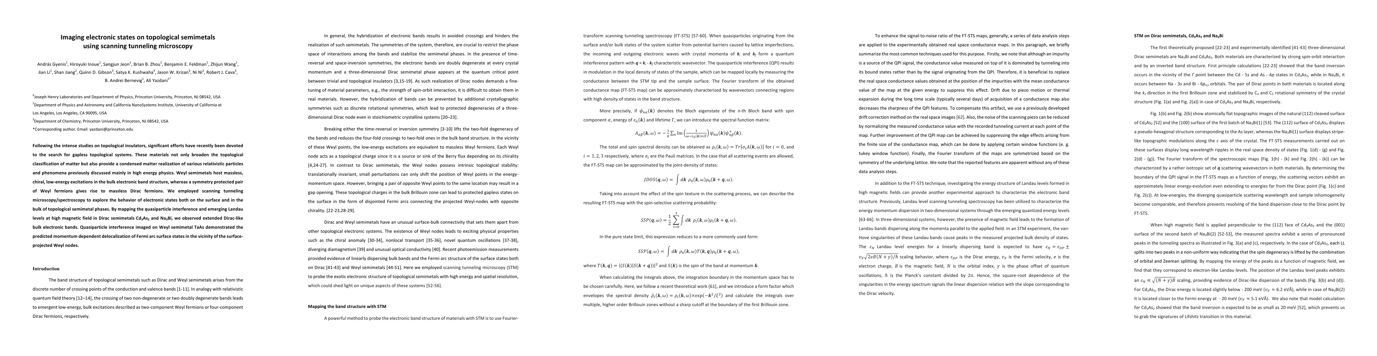 This paper employs scanning tunneling microscopy/spectroscopy to investigate electronic states in topological semimetals, revealing extended Dirac-like bulk bands in Cd$_3$As$_2$ and Na$_3$Bi, and demonstrating momentum-dependent Fermi arc surface states in Weyl semimetal TaAs.