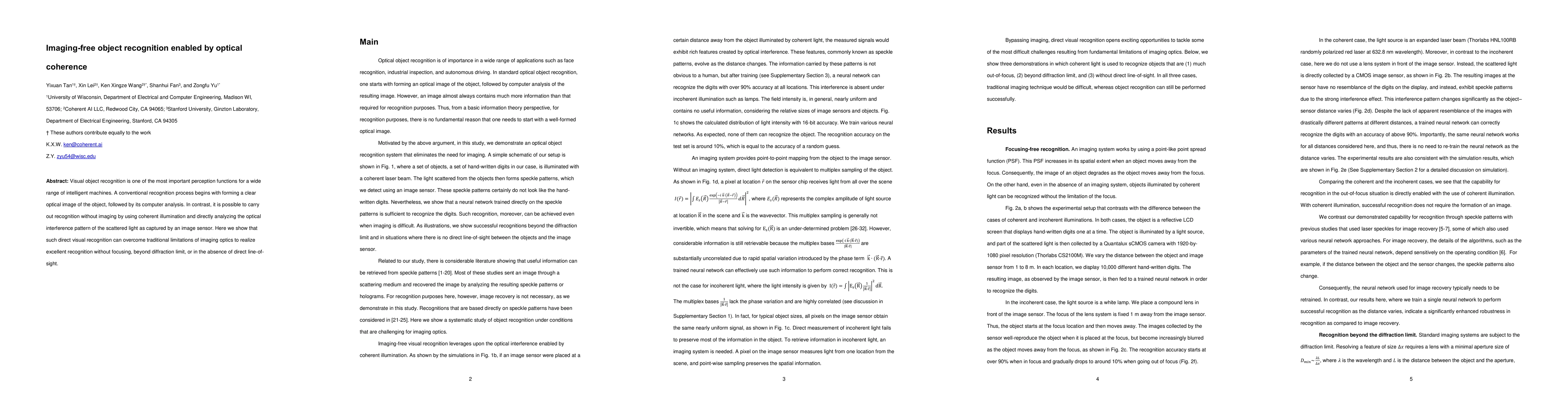 Visual object recognition is one of the most important perception functions for a wide range of intelligent machines. A conventional recognition process begins with forming a clear optical image of the object, followed by its computer analysis. In contrast, it is possible to carry out recognition without imaging by using coherent illumination and directly analyzing the optical interference pattern of the scattered light as captured by an image sensor. Here we show that such direct visual recognition can overcome traditional limitations of imaging optics to realize excellent recognition without focusing, beyond diffraction limit, or in the absence of direct line-of-sight.