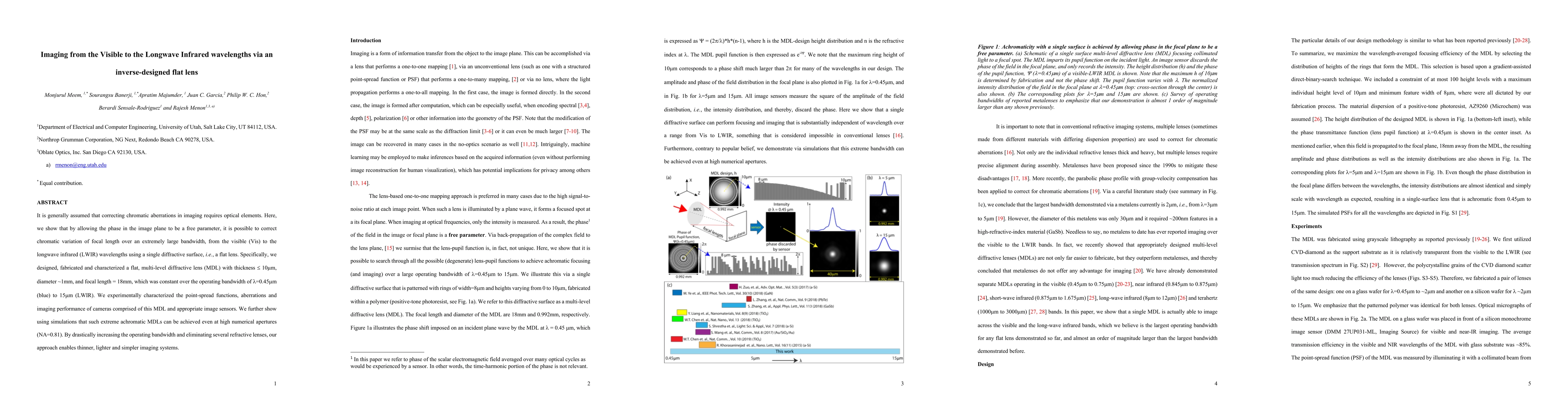 It is generally assumed that correcting chromatic aberrations in imaging requires optical elements. Here, we show that by allowing the phase in the image plane to be a free parameter, it is possible to correct chromatic variation of focal length over an extremely large bandwidth, from the visible (Vis) to the longwave infrared (LWIR) wavelengths using a single diffractive surface, i.e., a flat lens. Specifically, we designed, fabricated and characterized a flat, multi-level diffractive lens (MDL) with thickness {\pounds} 10{\mu}m, diameter ~1mm, and focal length = 18mm, which was constant over the operating bandwidth of l=0.45{\mu}m (blue) to 15{\mu}m (LWIR). We experimentally characterized the point-spread functions, aberrations and imaging performance of cameras comprised of this MDL and appropriate image sensors. We further show using simulations that such extreme achromatic MDLs can be achieved even at high numerical apertures (NA=0.81). By drastically increasing the operating bandwidth and eliminating several refractive lenses, our approach enables thinner, lighter and simpler imaging systems.