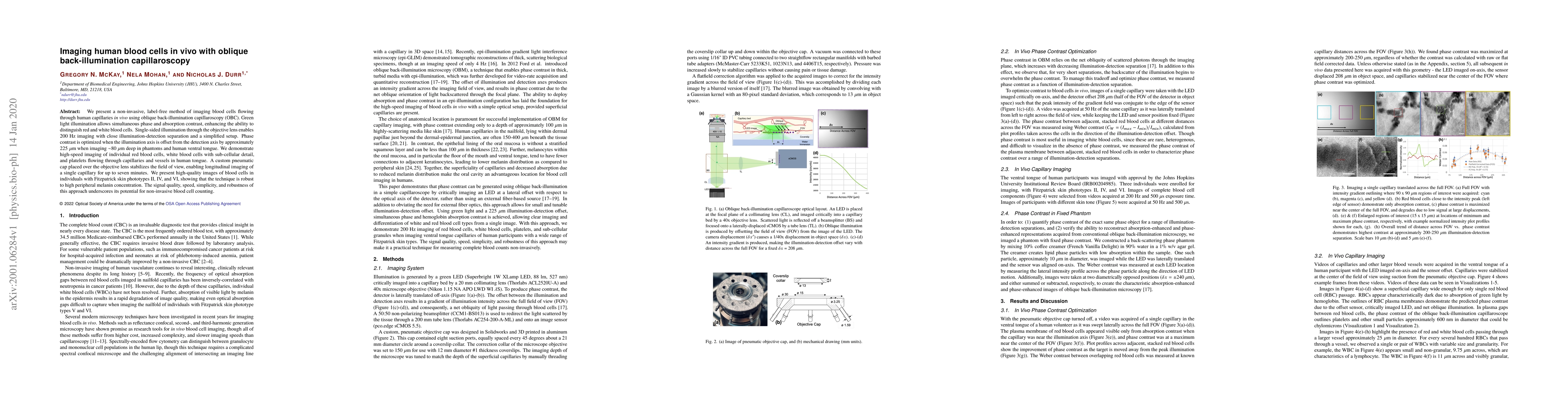 This paper introduces a novel non-invasive imaging technique called oblique back-illumination capillaroscopy (OBC) for visualizing blood cells in human capillaries in vivo. The method uses green light to achieve high-speed imaging of red and white blood cells, as well as platelets, demonstrating robustness across different skin types.
