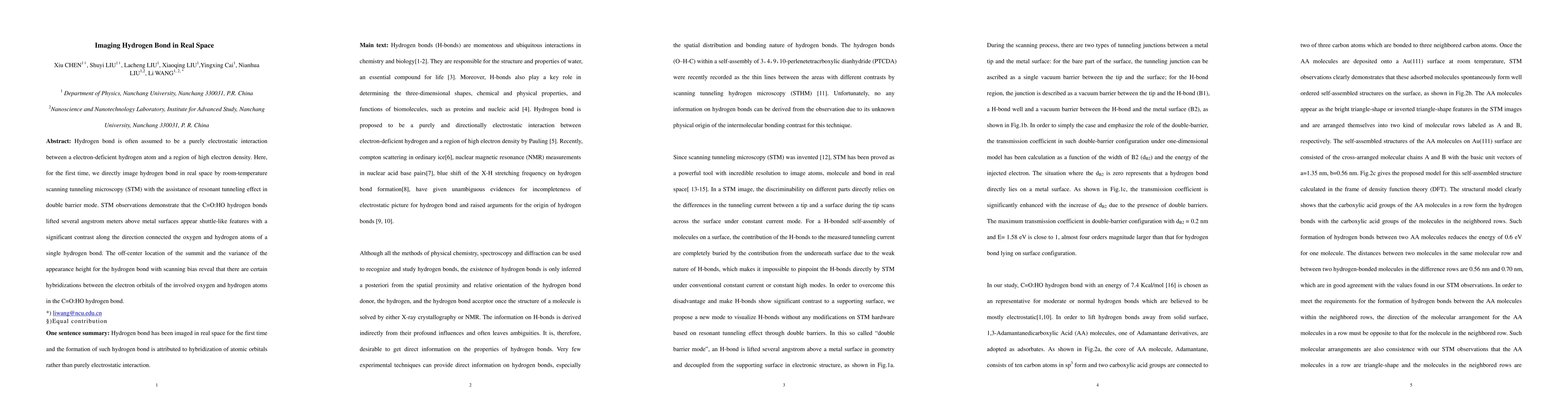This study directly images hydrogen bonds in real space using room-temperature scanning tunneling microscopy, revealing shuttle-like features and indicating hybridization between oxygen and hydrogen atoms. The findings challenge the purely electrostatic view of hydrogen bonds.