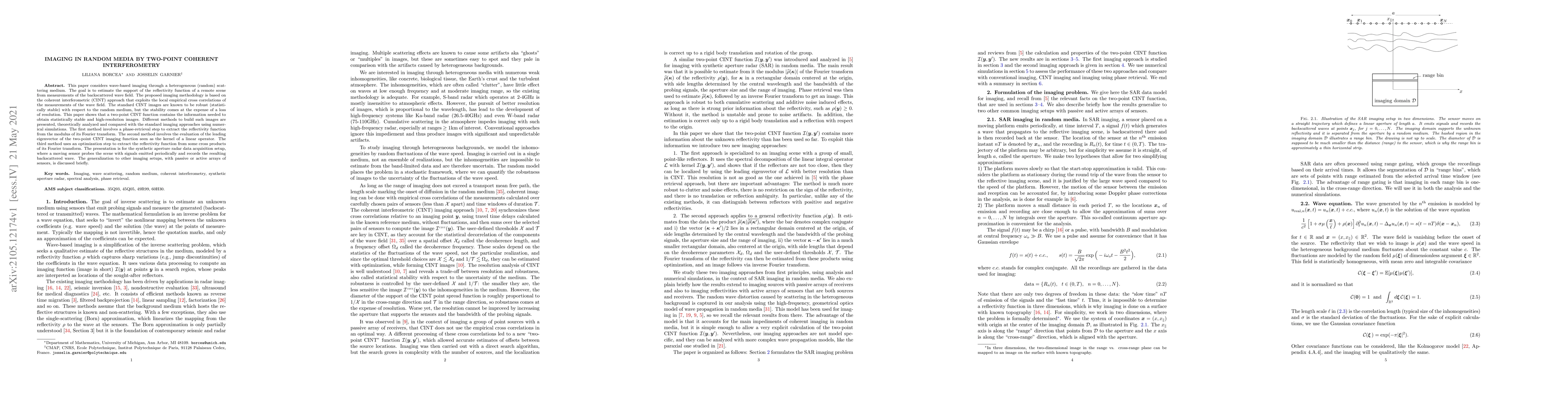 This paper considers wave-based imaging through a heterogeneous (random) scattering medium. The goal is to estimate the support of the reflectivity function of a remote scene from measurements of the backscattered wave field. The proposed imaging methodology is based on the coherent interferometric (CINT) approach that exploits the local empirical cross correlations of the measurements of the wave field. The standard CINT images are known to be robust (statistically stable) with respect to the random medium, but the stability comes at the expense of a loss of resolution. This paper shows that a two-point CINT function contains the information needed to obtain statistically stable and high-resolution images. Different methods to build such images are presented, theoretically analyzed and compared with the standard imaging approaches using numerical simulations. The first method involves a phase-retrieval step to extract the reflectivity function from the modulus of its Fourier transform. The second method involves the evaluation of the leading eigenvector of the two-point CINT imaging function seen as the kernel of a linear operator. The third method uses an optimization step to extract the reflectivity function from some cross products of its Fourier transform. The presentation is for the synthetic aperture radar data acquisition setup, where a moving sensor probes the scene with signals emitted periodically and records the resulting backscattered wave. The generalization to other imaging setups, with passive or active arrays of sensors, is discussed briefly.