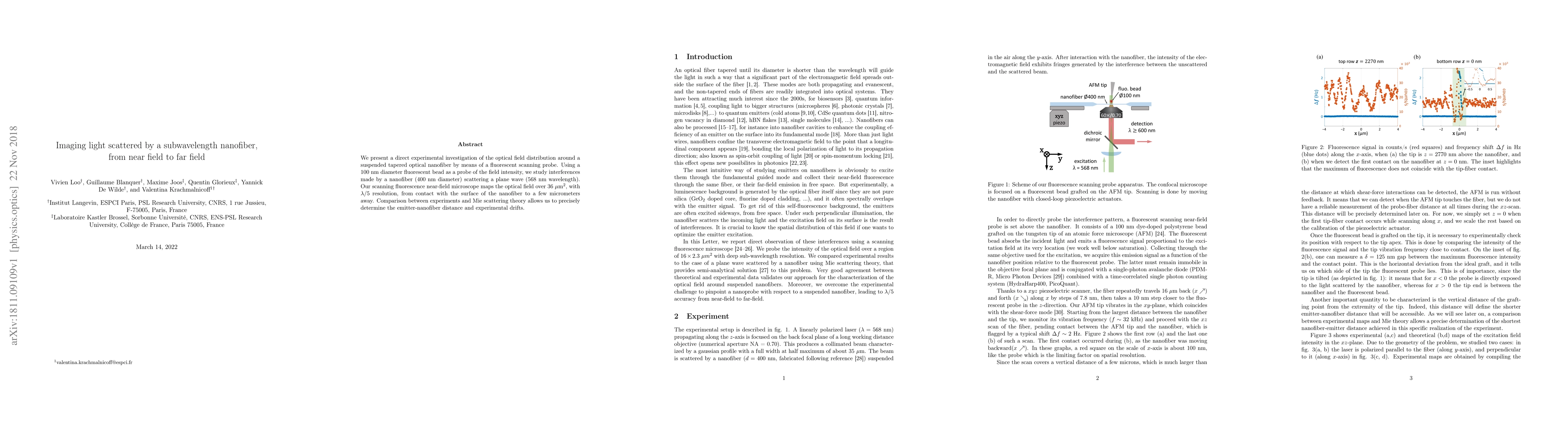 This paper investigates the optical field distribution around a subwavelength nanofiber using a fluorescent scanning probe. The study maps the scattered light field with high resolution, revealing interference patterns and validating Mie scattering theory.