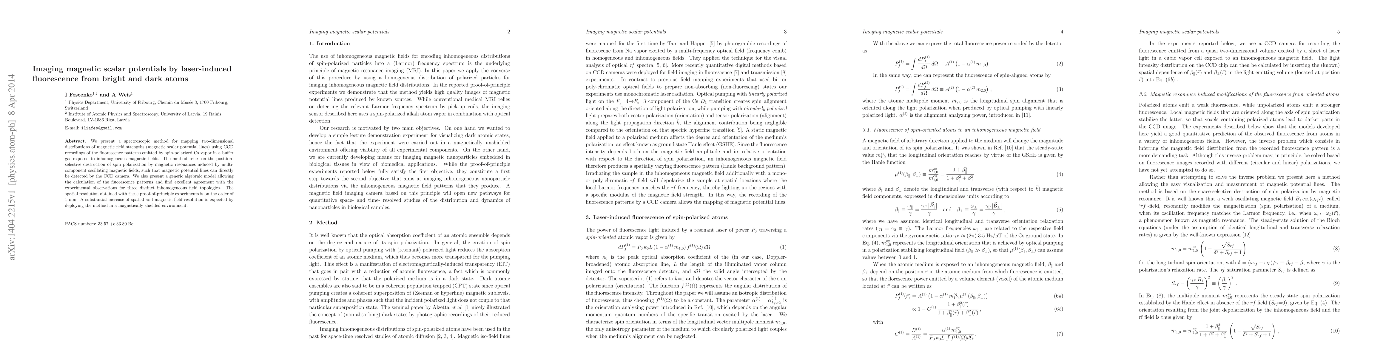 We present a spectroscopic method for mapping two-dimensional distributions of magnetic field strengths (magnetic scalar potential lines) using CCD recordings of the fluorescence patterns emitted by spin-polarized Cs vapor in a buffer gas exposed to inhomogeneous magnetic fields. The method relies on the position-selective destruction of spin polarization by magnetic resonances induced by multi-component oscillating magnetic fields, such that magnetic potential lines can directly be detected by the CCD camera. We also present a generic algebraic model allowing the calculation of the fluorescence patterns and find excellent agreement with the experimental observations for three distinct inhomogeneous field topologies. The spatial resolution obtained with these proof-of-principle experiments is on the order of 1 mm. A substantial increase of spatial and magnetic field resolution is expected by deploying the method in a magnetically shielded environment.