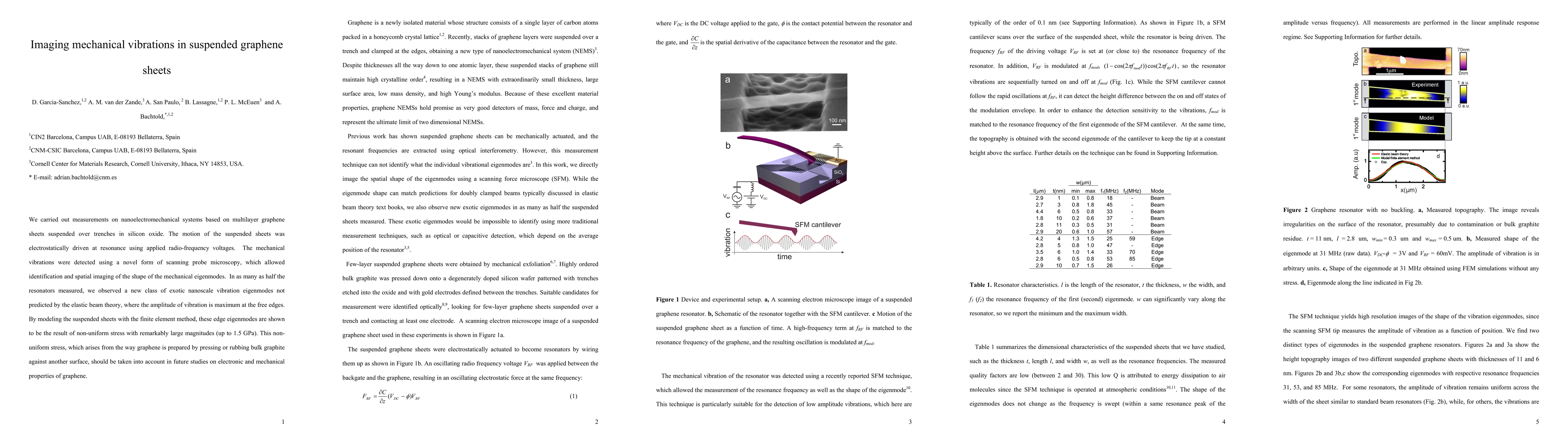 This research measures mechanical vibrations in suspended graphene sheets using novel scanning probe microscopy, revealing unexpected nanoscale eigenmodes with maximum vibration at the edges, attributed to non-uniform stress from graphene preparation methods. These findings highlight the need to consider stress when studying graphene's electronic and mechanical properties.