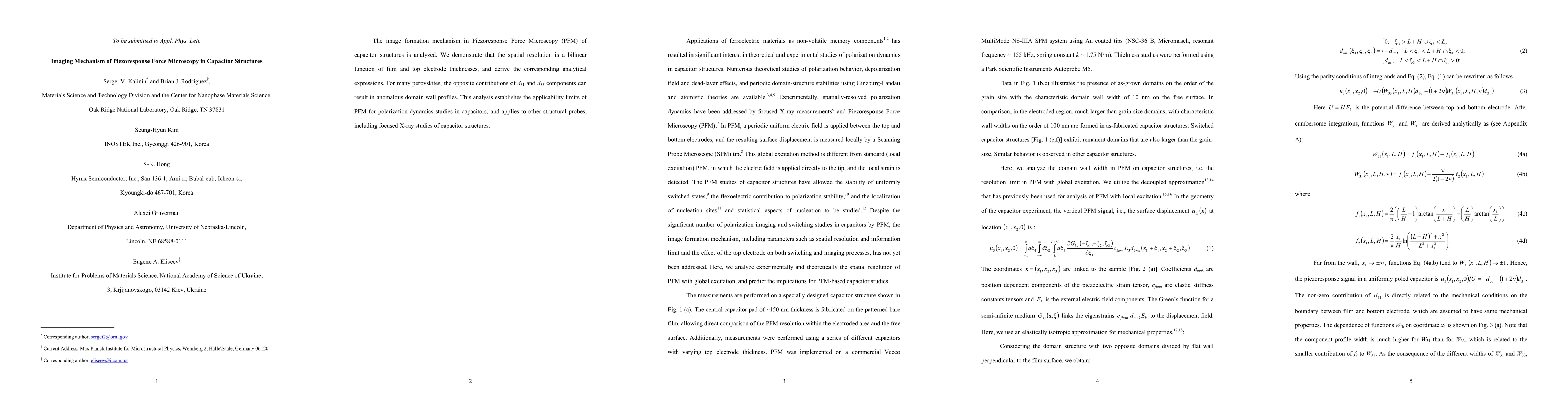 This paper analyzes the imaging mechanism in Piezoresponse Force Microscopy (PFM) of capacitor structures, showing that spatial resolution is a bilinear function of film and electrode thicknesses. It also identifies the contributions of d31 and d33 components that can lead to anomalous domain wall profiles, establishing PFM's applicability limits for polarization dynamics studies.