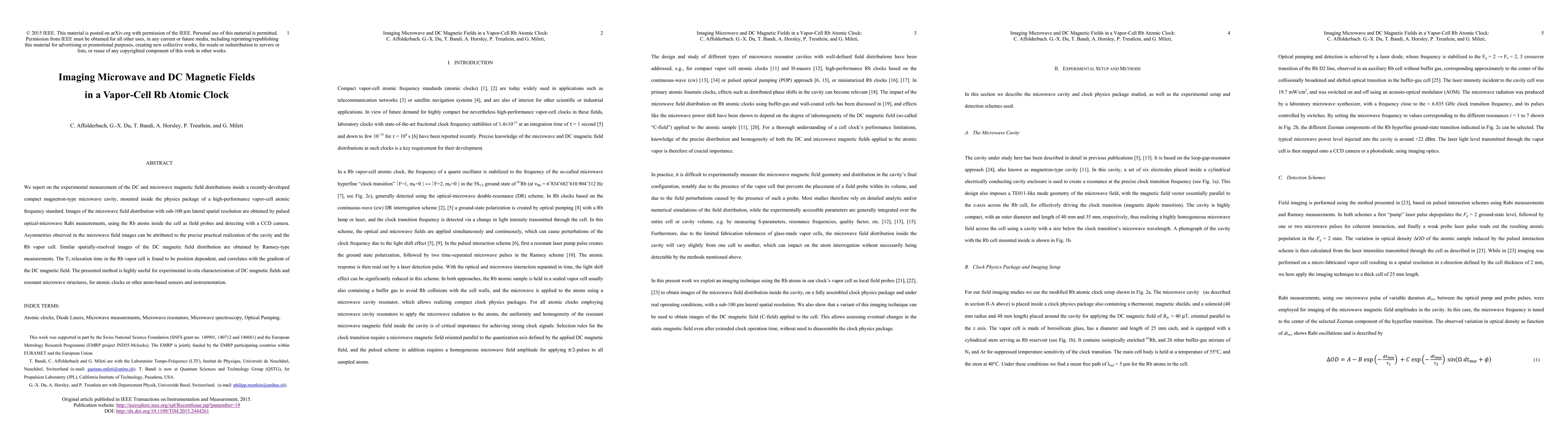 This research measures DC and microwave magnetic field distributions inside a compact magnetron-type microwave cavity used in a vapor-cell Rb atomic clock. It employs pulsed optical-microwave Rabi measurements and Ramsey-type techniques to achieve sub-100 µm resolution, revealing field asymmetries and position-dependent T2 relaxation times correlated with DC magnetic field gradients.
