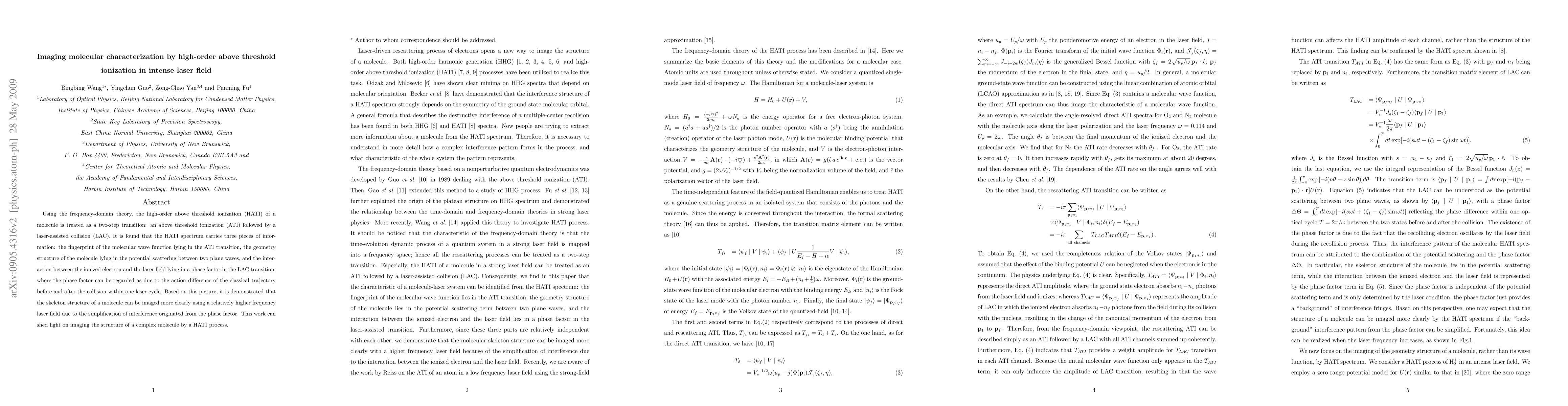 This paper uses high-order above threshold ionization (HATI) in intense laser fields to characterize molecular structures via a two-step transition process. The HATI spectrum reveals molecular wave function, geometry, and electron-laser field interactions, enabling clearer imaging of molecular skeletons with higher frequency lasers.