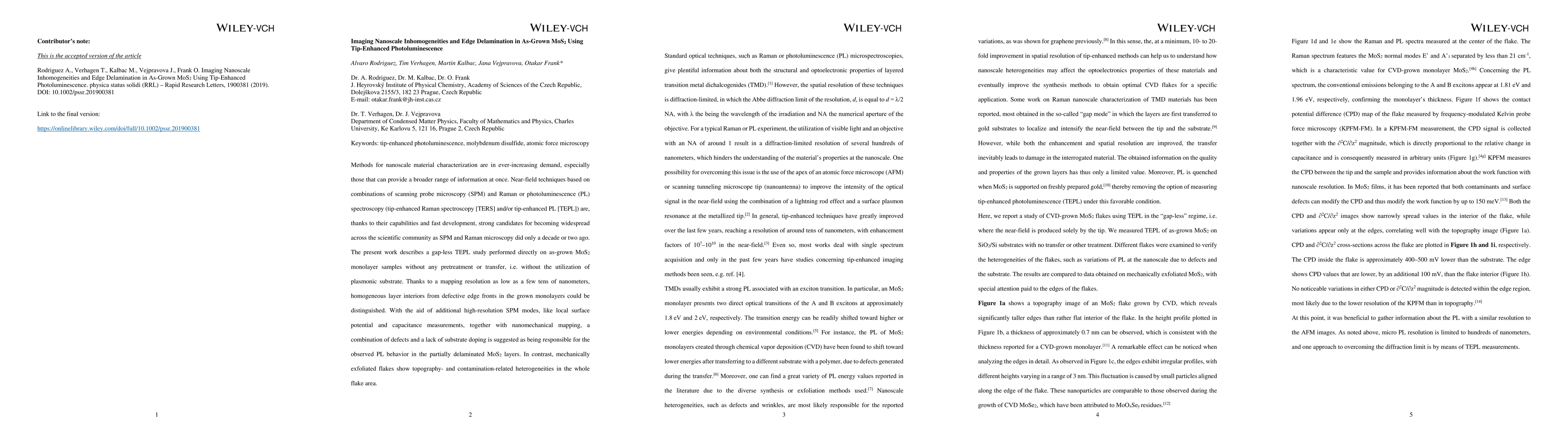 Methods for nanoscale material characterization are in ever-increasing demand, especially those that can provide a broader range of information at once. Near-field techniques based on combinations of scanning probe microscopy (SPM) and Raman or photoluminescence (PL) spectroscopy (tip-enhanced Raman spectroscopy [TERS] and/or tip-enhanced photoluminescence [TEPL]) are, thanks to their capabilities and fast development, strong candidates for becoming widespread across the scientific community as SPM and Raman microscopy did only a decade or two ago. Herein, a gap-less TEPL study is performed directly on as-grown MoS2 monolayer samples without any pretreatment or transfer, i.e., without the utilization of plasmonic substrate. Thanks to a mapping resolution as low as a few tens of nanometers, homogeneous layer interiors from defective edge fronts in the grown monolayers can be distinguished. With the aid of additional high-resolution SPM modes, like local surface potential and capacitance measurements, together with nanomechanical mapping, a combination of defects and a lack of substrate doping is suggested as being responsible for the observed PL behavior in the partially delaminated MoS2 layers. In contrast, mechanically exfoliated flakes show topography- and contamination-related heterogeneities in the whole flake area.