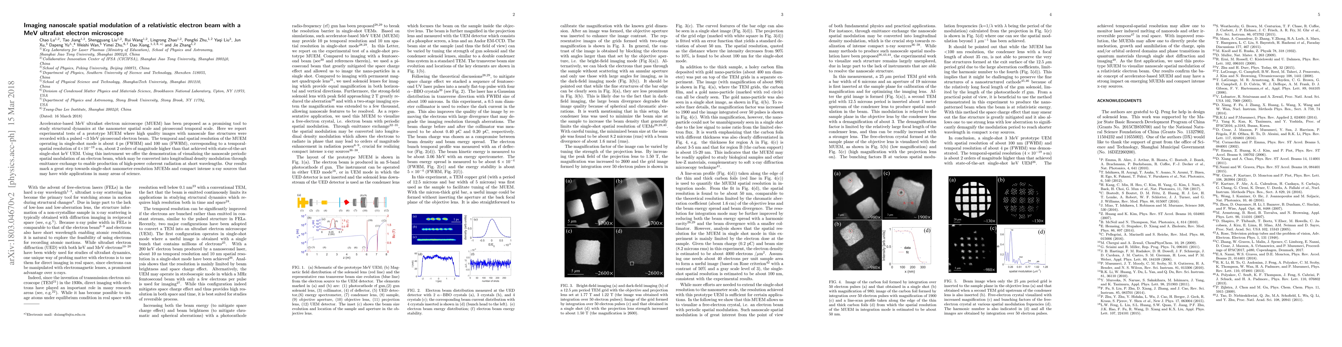 This paper reports on the successful imaging of nanoscale spatial modulation in a relativistic electron beam using a prototype MeV ultrafast electron microscope (MUEM), achieving a temporal resolution of 4 ps and a spatial resolution of 100 nm. The MUEM's high resolution may enable the production of high-power coherent radiation, advancing applications in various scientific fields.