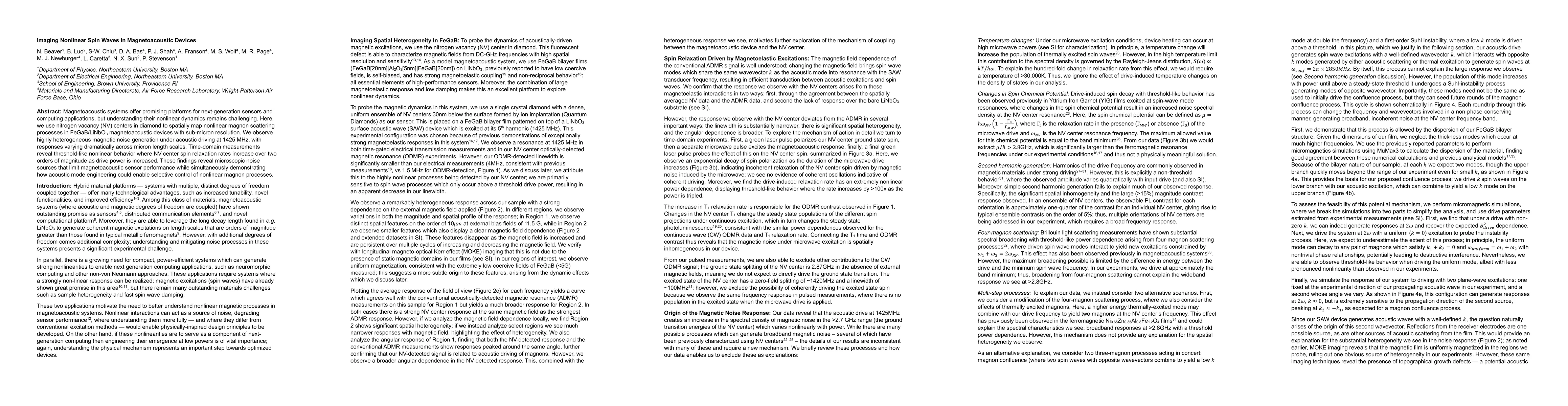 Magnetoacoustic systems offer promising platforms for next-generation sensors and computing applications, but understanding their nonlinear dynamics remains challenging. Here, we use nitrogen vacancy (NV) centers in diamond to spatially map nonlinear magnon scattering processes in FeGaB/LiNbO3 magnetoacoustic devices with sub-micron resolution. We observe highly heterogeneous magnetic noise generation under acoustic driving at 1425 MHz, with responses varying dramatically across micron length scales. Time-domain measurements reveal threshold-like nonlinear behavior where NV center spin relaxation rates increase over two orders of magnitude as drive power is increased. These findings reveal microscopic noise sources that limit magnetoacoustic sensor performance while simultaneously demonstrating how acoustic mode engineering could enable selective control of nonlinear magnon processes.